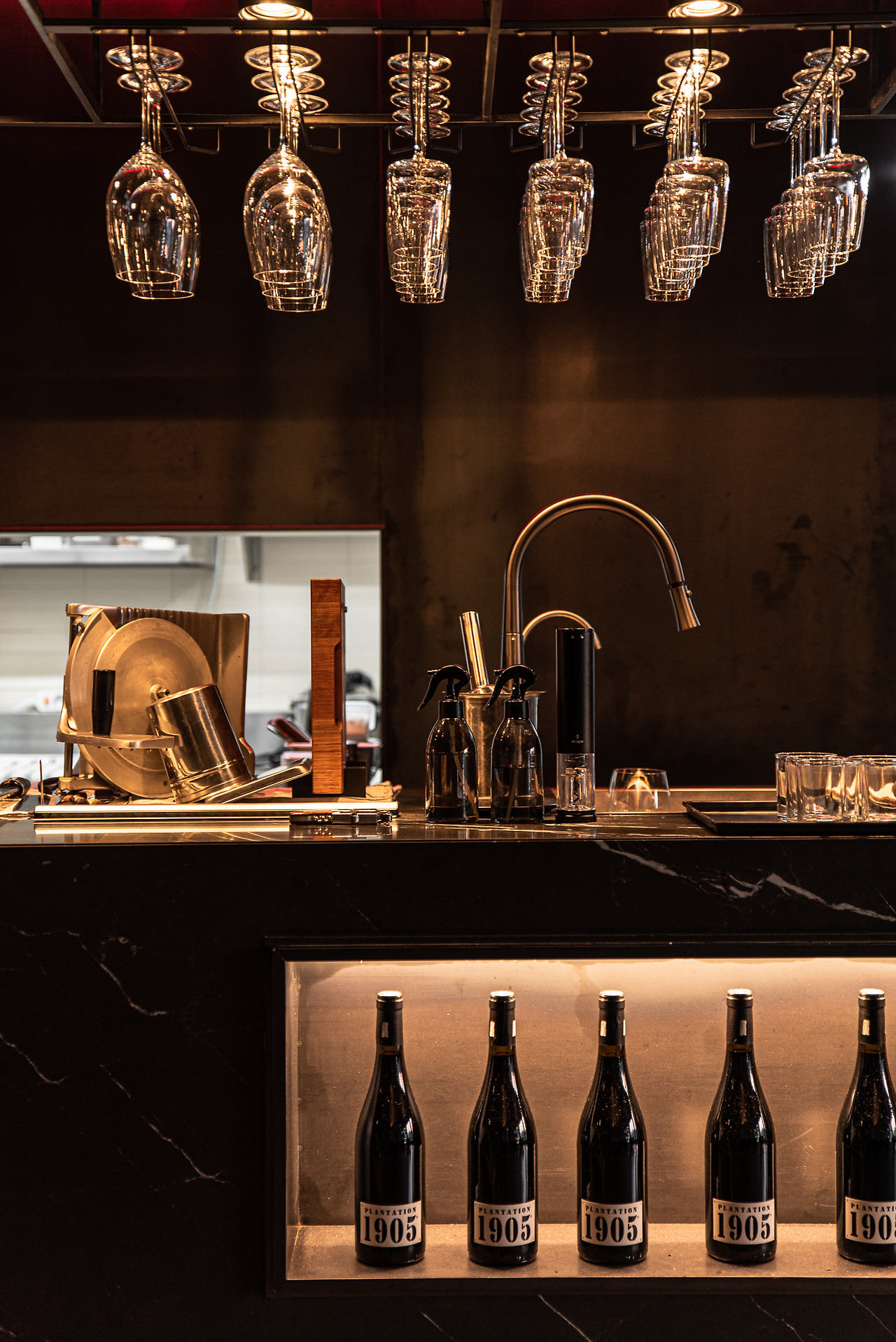 내부 공간은 사진에서 보이는 만큼 밝지 않다. 자연광이 닿지 않아 매우 어두운 편이다. 불편하지 않을 만큼의 빛을 제공하는 조명은 기물의 선을 은은하게 비춘다. 특히 와인잔을 조명에 비추면 드러나는 투명함과 역광이 만들어내는 대비가 아름답다. 앞서 둘러본 넓은 공간에서 볼 수 없던 인공광의 연출이 특유의 감상을 더한다.