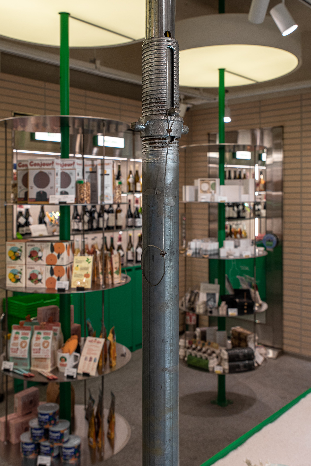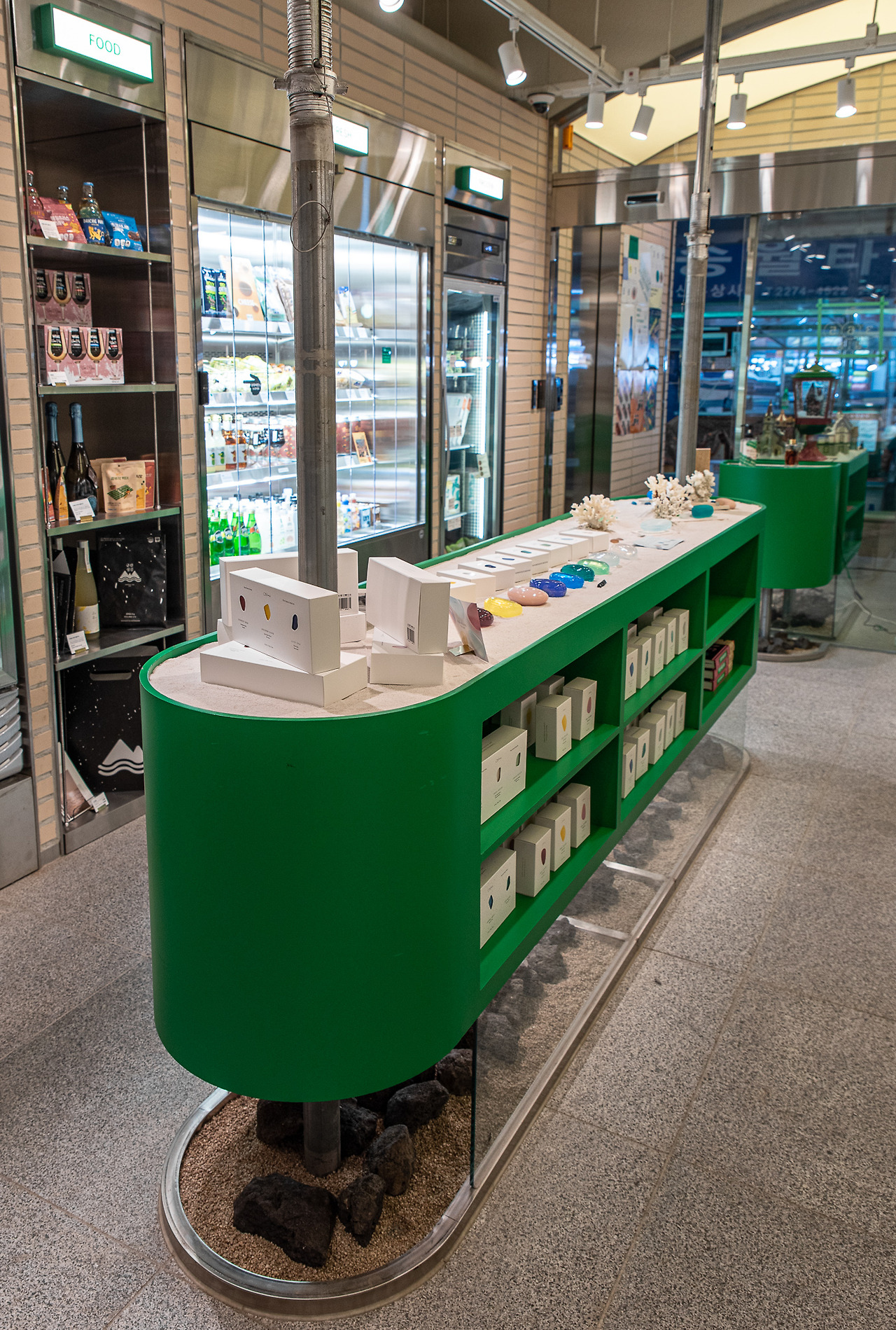 365일장의 차별화는 사업 방향뿐만 아니라 공간의 시각성에서도 그 빛을 발한다. 주변 상점들이 언젠가 변모해야 한다면 좋은 참고가 될만한 내부 인테리어가 그러하다. 밟은 조도와 깔끔한 구조가 명랑한 첫인상을 심어준다. 초록과 베이지를 사용한 배색과 분할이 명확하다. 특히 건물의 골조와 철제 기둥을 그대로 활용하여 오랜 건물의 일부를 기억했다. 새로운 감각을 덧칠하는 요즘의 리모델링 방식 중 하나이다.