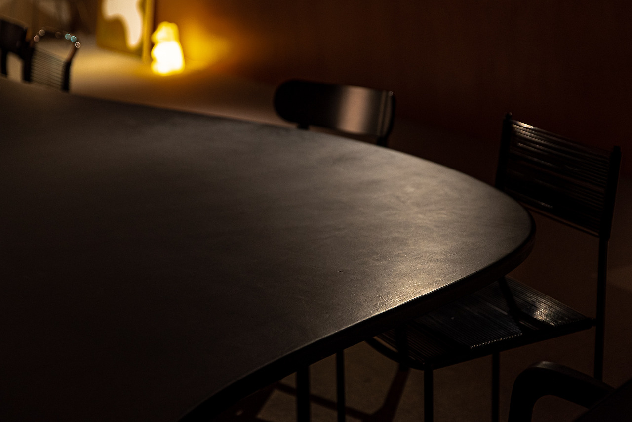 안쪽으로 뻗은 공간을 따라 위치한 검은색의 곡면 테이블이 시선의 중심을 잡는다. 이름은 오아시스 테이블, 아래의 사진과 같이 여러 조각을 이어 붙인 아이디어의 결과물이다. 각 판들이 만나는 접점은 섬세한 마감 덕분에 거의 티가 나지 않는다. 등고선의 윤곽 혹은 아메바의 모양에서 영감을 얻은 듯한 흥미로운 외관이다.