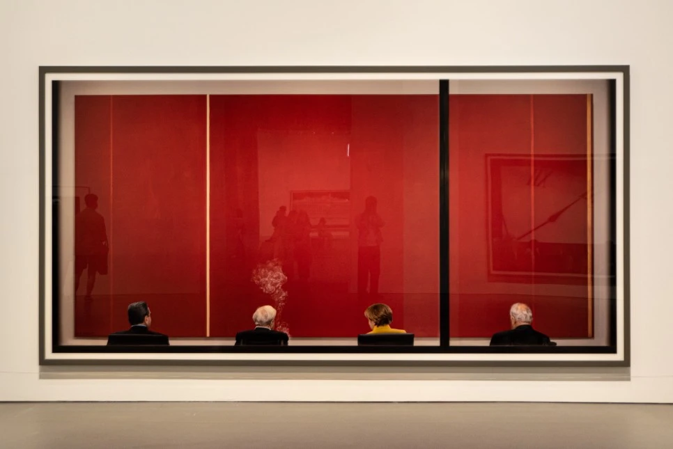 작품을 감상하는 네 사람의 모습이 마치 한 폭의 그림같이 표현되었다. 그들의 뒷모습으로부터 긴밀한 대화와 무관심, 국가 정세와 형국에 관한 무언의 상황들을 짐작해 본다. 아래의 사진은 세계에서 가장 고가로 경매되었던 라인 강 2의 연작인 라인 강 3이다. 푸르렀던 생기를 잃고 파괴되는 상황의 강을 담아냈다. 이 작품 역시 사람들을 모두 지우고 본인만의 시점을 녹여내 마치 고속도로와 같은 평평한 강의 심상을 표현했다.