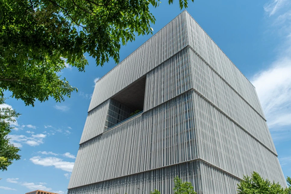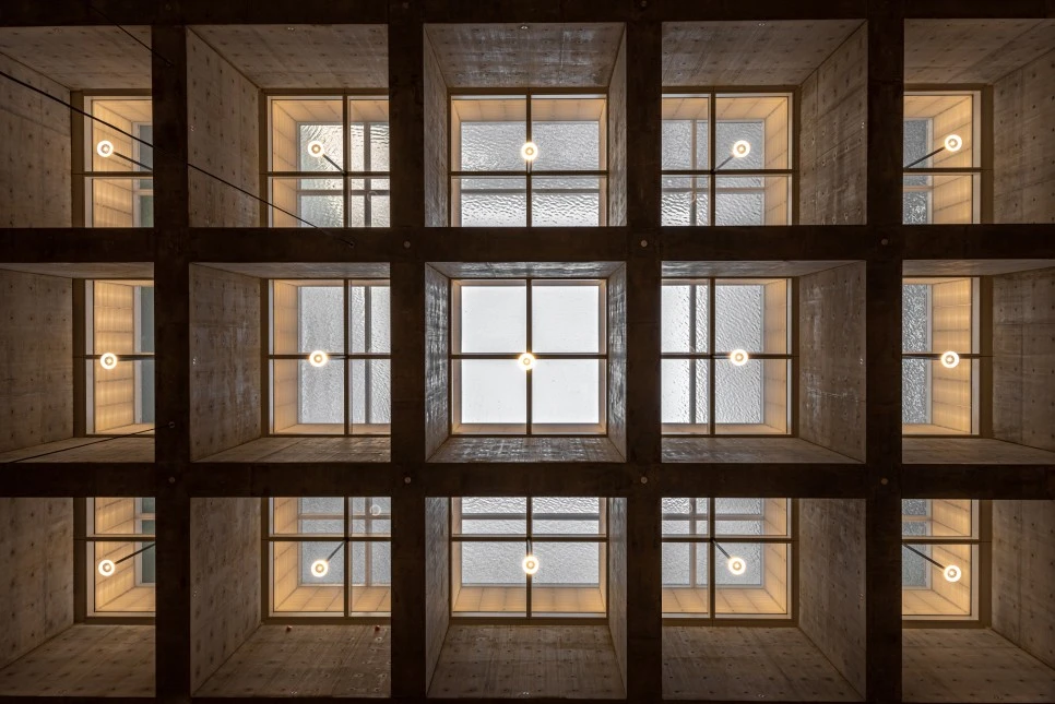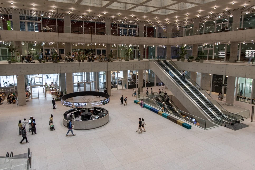 영국 건축가 데이비드 차퍼필드가 디자인한 아모레 사옥의 내부는 외관만큼이나 압도적이다. 로비의 중앙을 과감하게 비워두고 천장을 높여 사람을 압도하는 공간감을 구현해냈다. 머리 위에서 자연광을 투과시키는 격자무늬 천장은 거대한 기하학 구조를 가지며 묘한 중력감을 우리에게 선사한다. 미술관에 입장하기 전부터 건축적 예술성을 뽐내며 개성을 전파하고 있는 것이다.
