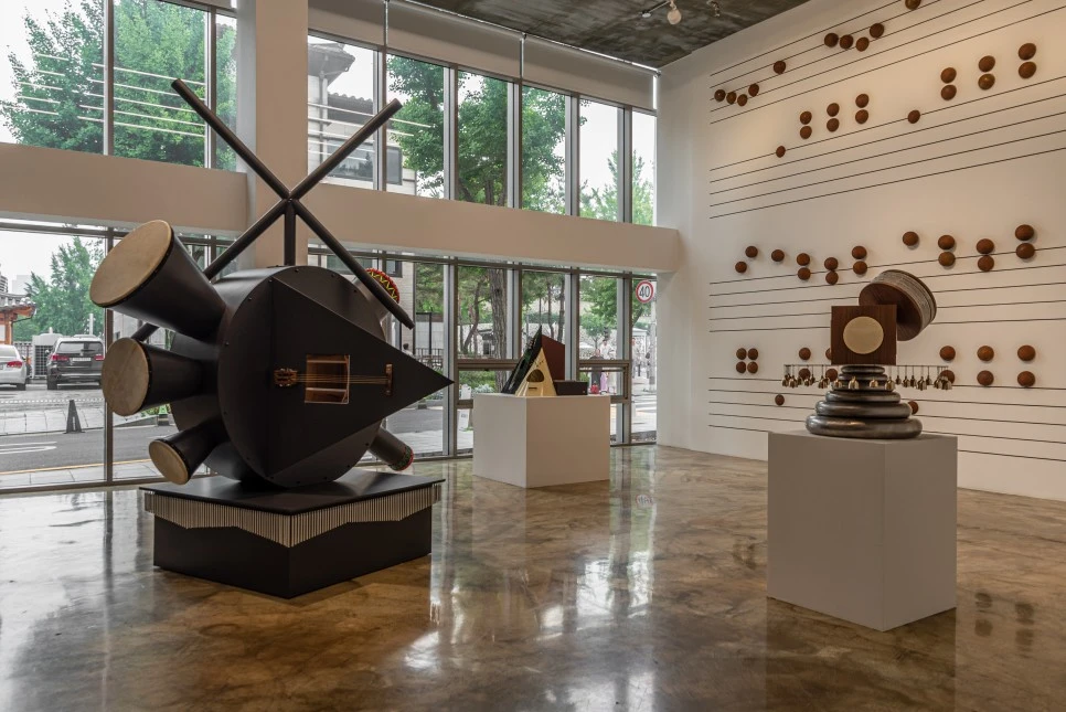 모션 라인은 애니메이션에서 인물 및 사물의 움직임을 선으로 표현하면서 이들의 소리, 감정, 움직임을 나타내거나 전후 동작의 흐름을 연결하는 효과이다. 쉽게 말해 존재의 움직임을 표현하는 것이다. 공간에 들어서자 악보가 그려진 벽면을 배경 삼아 다양한 오브제들이 각각의 외형과 크기로 선율을 만들어내고 있음을 확인할 수 있다. 어디서도 본 적 없는 고유한 외관과 물성으로 공간의 여백을 채운다.