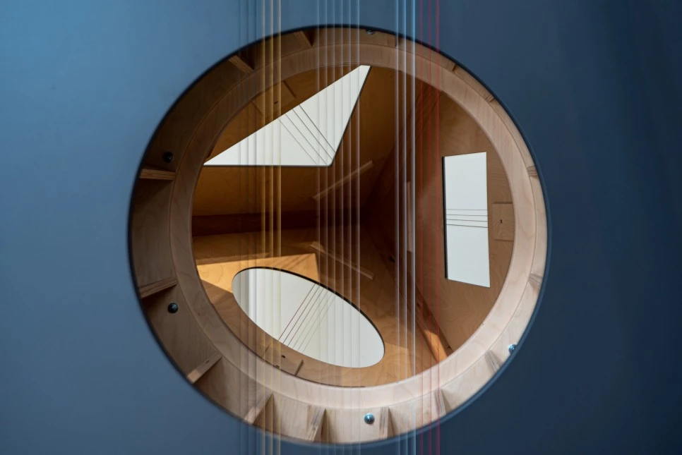 평면에 원형의 구멍을 뚫었다. 구멍 앞에 기타 줄과 같은 선들이 색칠되어 있고, 그 너머로 보이는 내부 공간은 나무의 재질로 되어있다. 특히 삼각형, 사각형, 원형이라는 기초적 도형의 형태들이 조화되어 있다. 본 사진은 특정 작품의 일부를 찍은 것이다. 물체의 외관과 재질을 창의적인 방식으로 조합하고 제시하는 작가 네빈 알라닥의 전시, 모션 라인(Motion Lines)을 소개한다.
