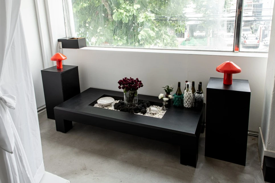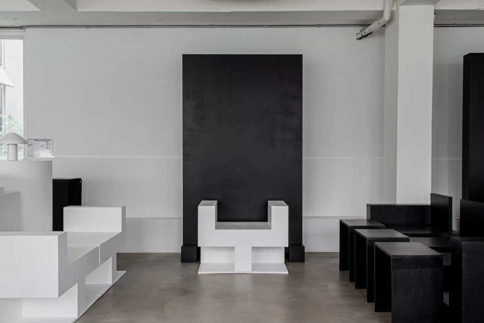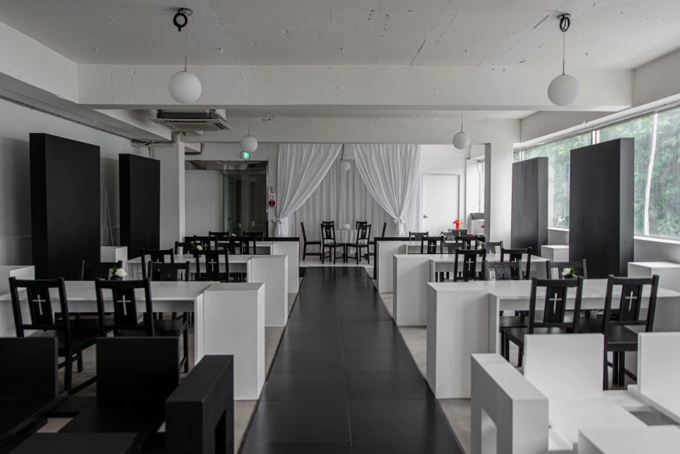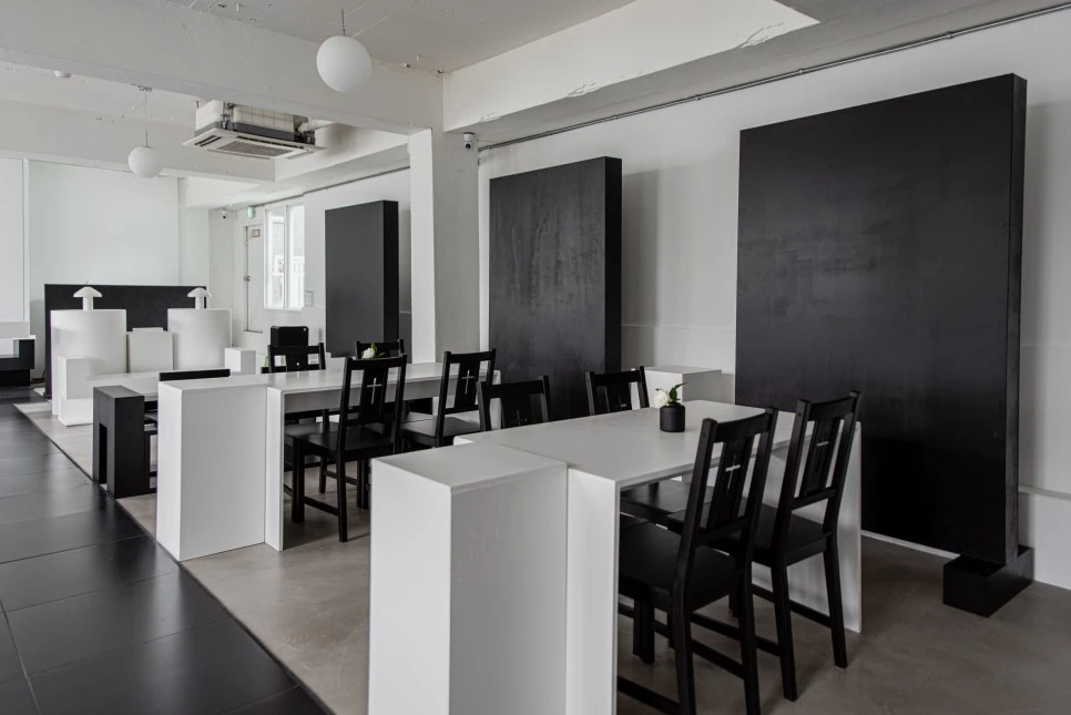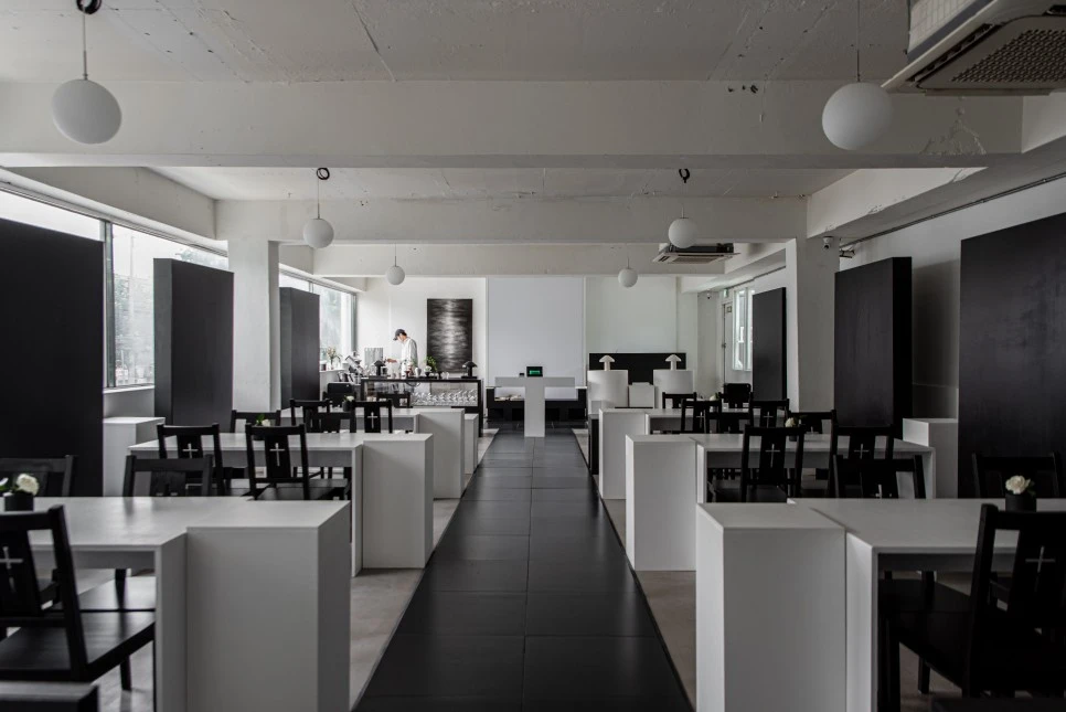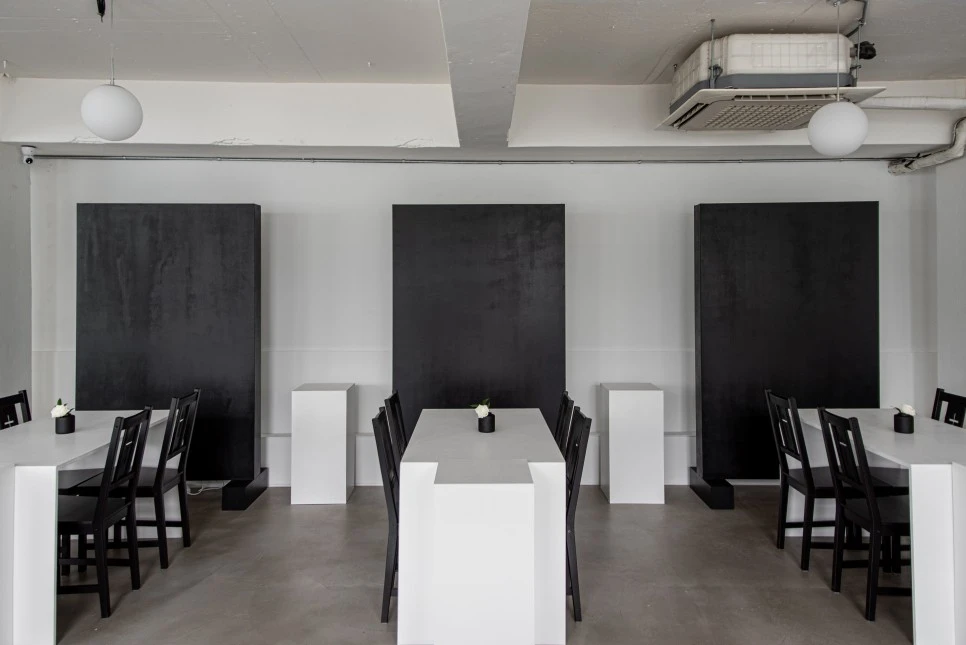 직사각형의 검은색 가벽 앞에 테이블과 의자가 반복적으로 놓여 단정한 리듬감을 형성한다. 묵직한 가벽이 공간의 무게중심을 잡아주는 역할을 한다. 전반적으로 반듯한 직선감이 돋보이는 실내 인테리어이다.