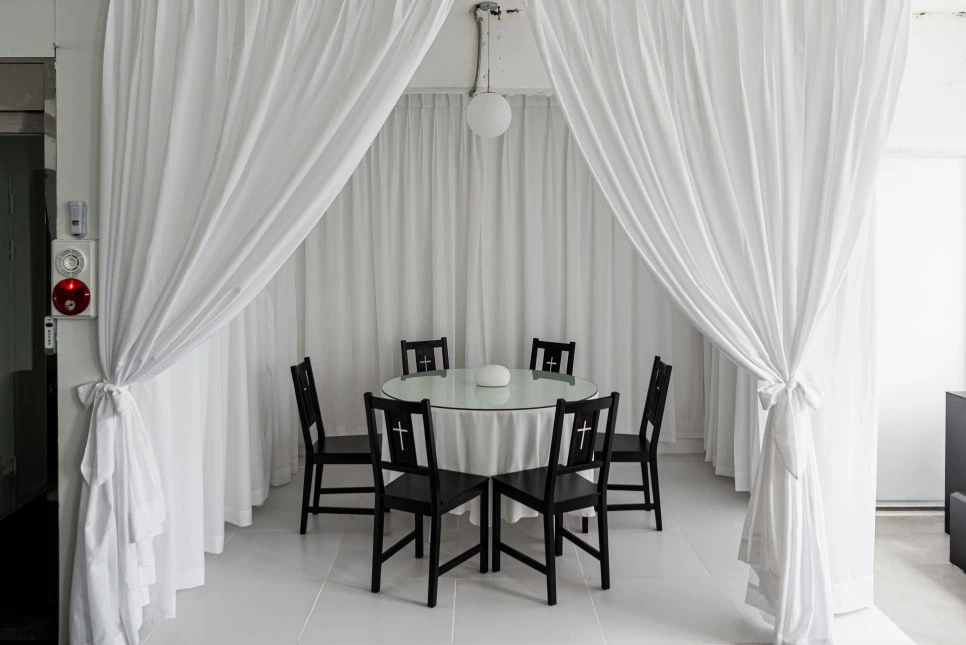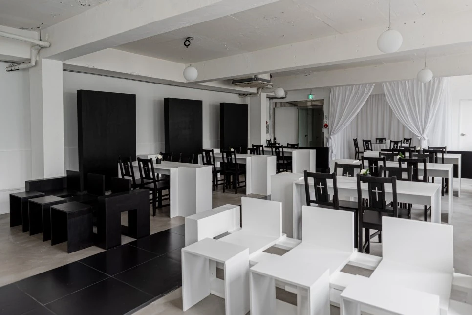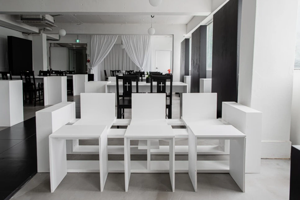 조용히 나누는 대화 혹은 회의를 도모해야 할 것 같은 원형 탁자가 보인다. 의자에 보이는 십자가 문양에서 종교적인 색채를 담은 공간임을 확인할 수 있다. 실제로 생츄어리의 대표는 크리스천이다. 본 공간을 통해 종교적 이념이나 교리를 내세우기보다 종교가 줄 수 있는 시각적 개성과 편안함의 가치를 녹여내고자 했다. 따라서 이름도 피난처 혹은 안식처를 의미하는 생츄어리로 지은 것이다.