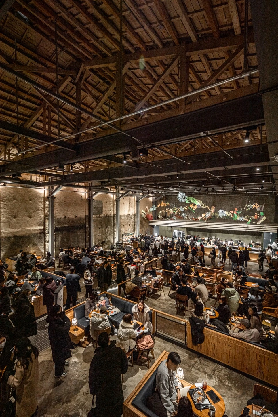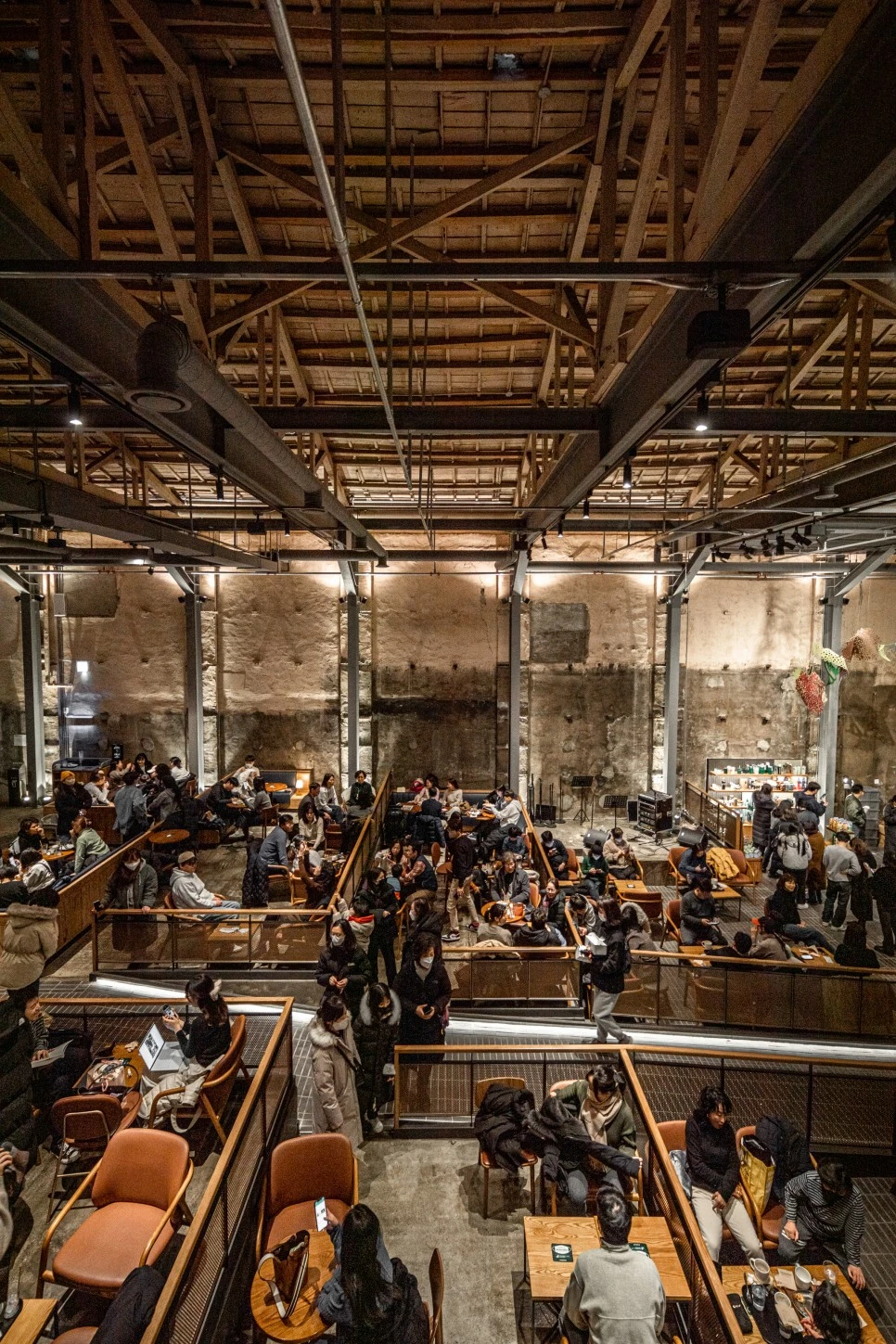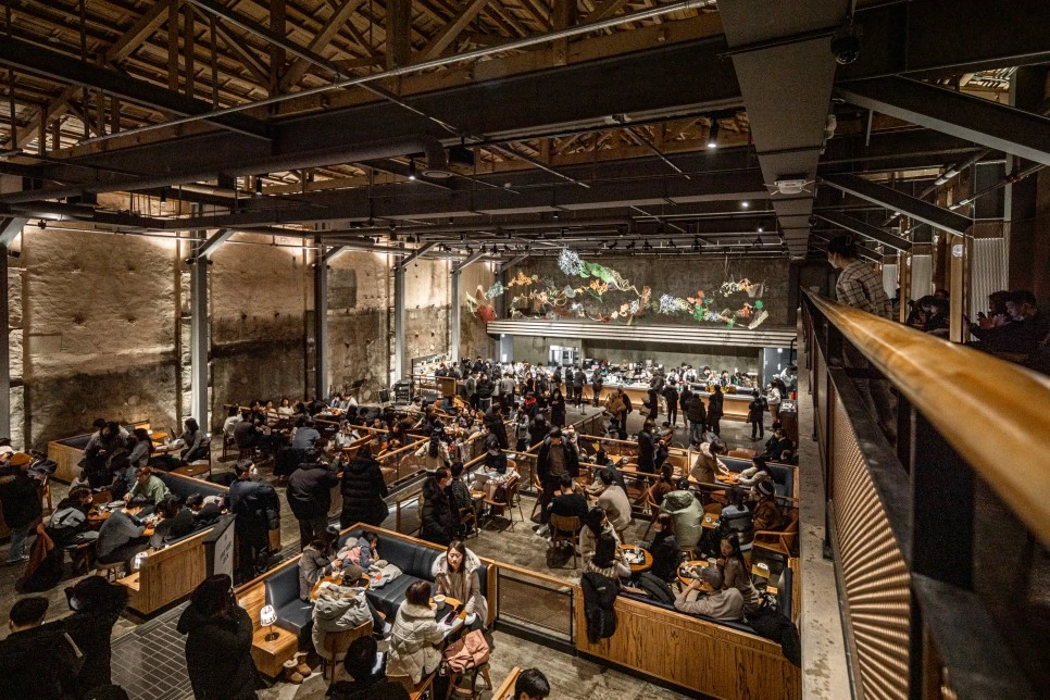 위층 좌석에서는 아래를 향해 길게 내려다보는 웅장한 시선을 느낄 수 있다. 소파 같은 좌석이 아늑함을 더한다. 주문 및 제조를 담당하는 바 위에는 여러 디자인 작품이 설치되어 공간에 생기를 더한다.