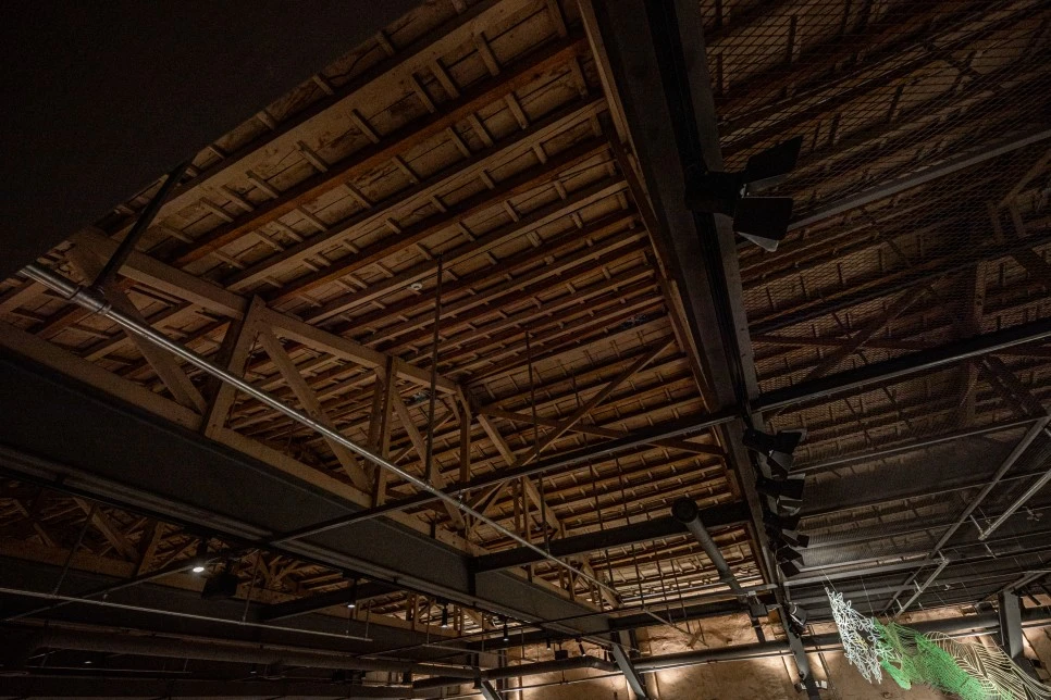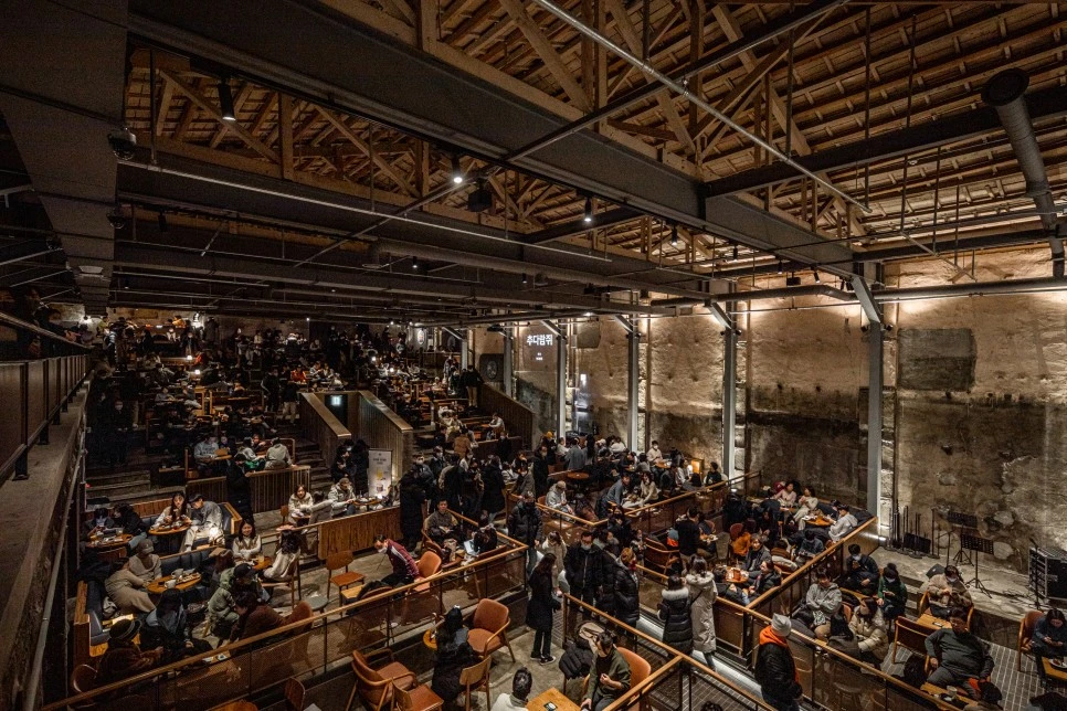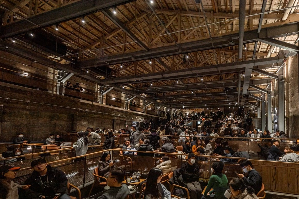 폐극장 공간을 리모델링한 동대문 가볼만한곳 스타벅스 1960점의 내부 모습이다. 기존 공간 구조를 그대로 살려낸 계단식 좌석이 인상적이다. 천장과 벽면 마감을 벗겨내 콘크리트 벽면과 지붕 구조가 원형 그대로 드러난다.