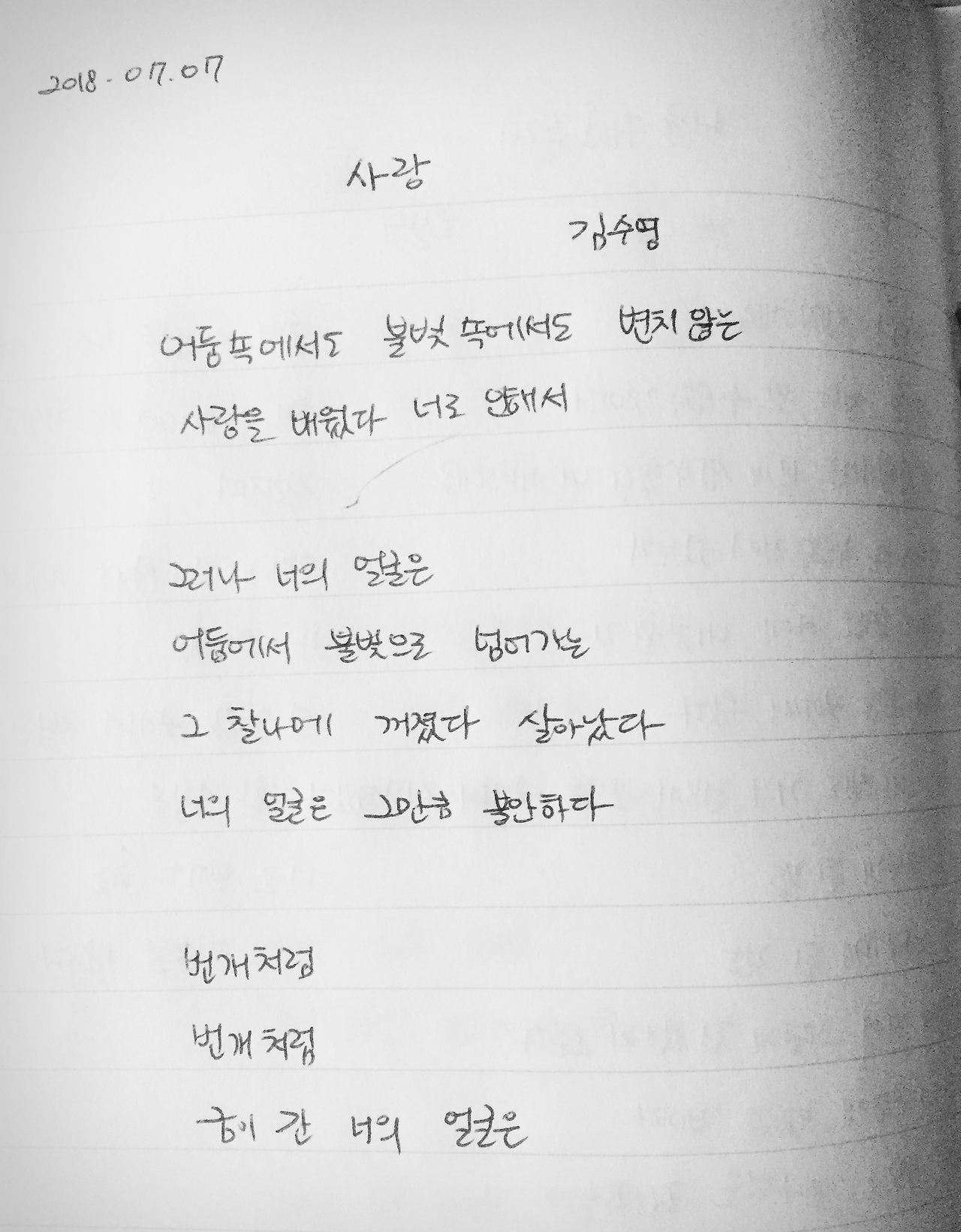 어둠 속에서도 불빛 속에서도 변치 않는사랑을 배웠다 너로 해서그러나 너의 얼굴은어둠에서 불빛으로 넘어가는그 찰나에 꺼졌다 살아났다너의 얼굴은 그만큼 불안하다번개처럼번개처럼금이 간 너의 얼굴은