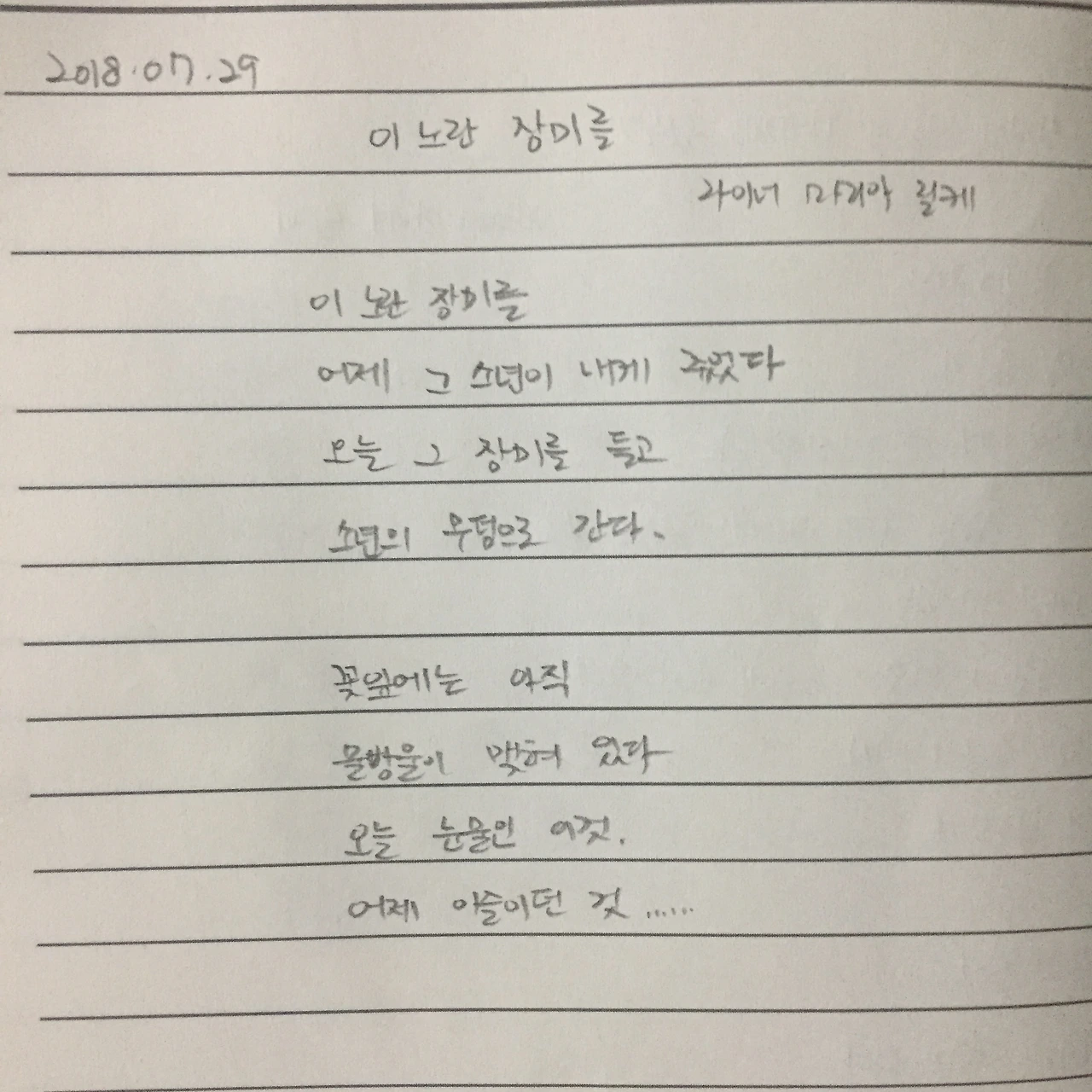 이 노란 장미를어제 그 소년이 내게 주었다.오늘 그 장미를 들고소년의 무덤으로 간다. 꽃잎에는 아직물방울이 맺혀 있다.오늘 눈물인 이것어제 이슬이던 것…….