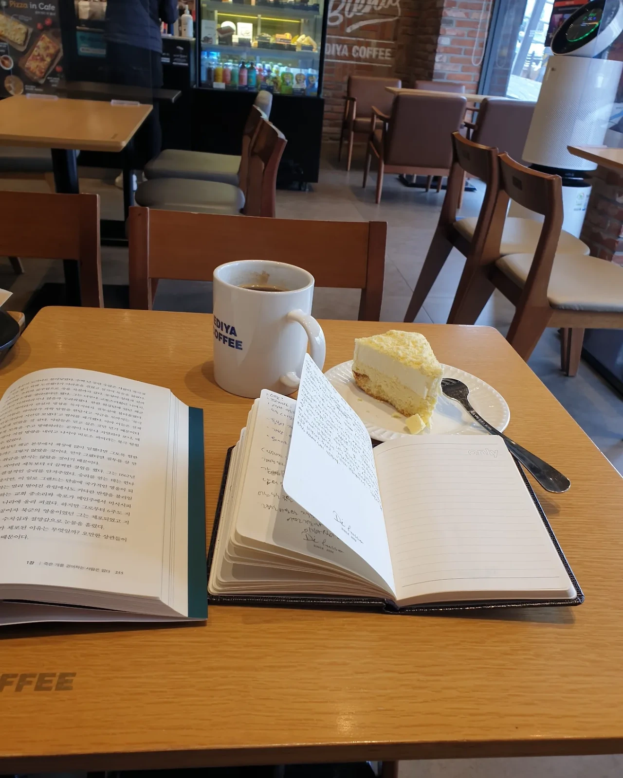 커피랑 케이크 먹으면서 모닝 페이지를 쓴다.