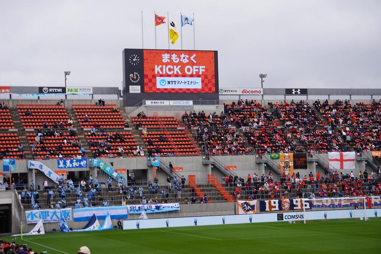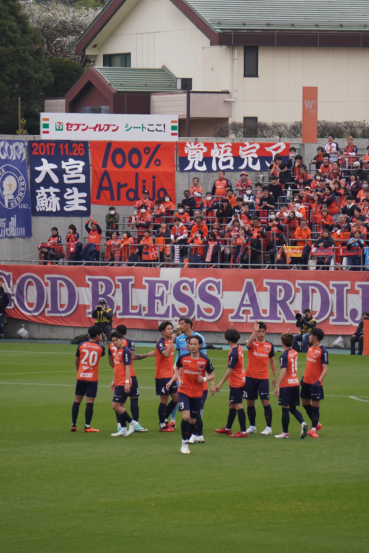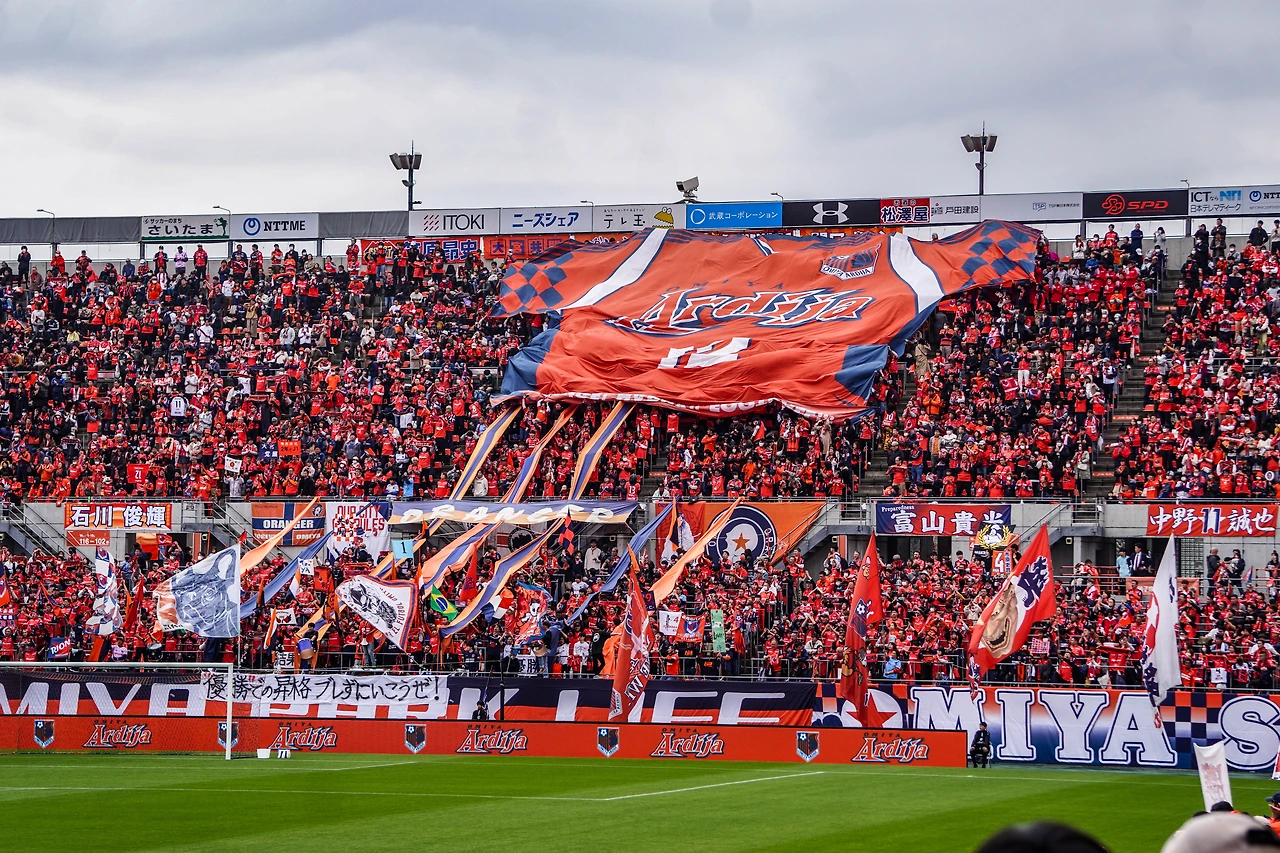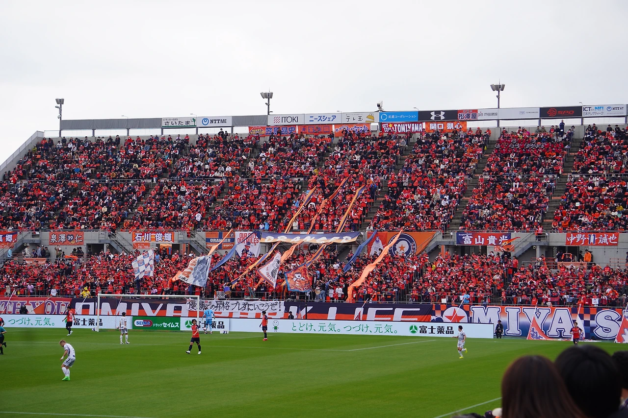 팀을 향한 변치 않는 마음을 가진 서포터들이 오미야의 승격을 위해 엄청난 열기로 응원하고 있었습니다