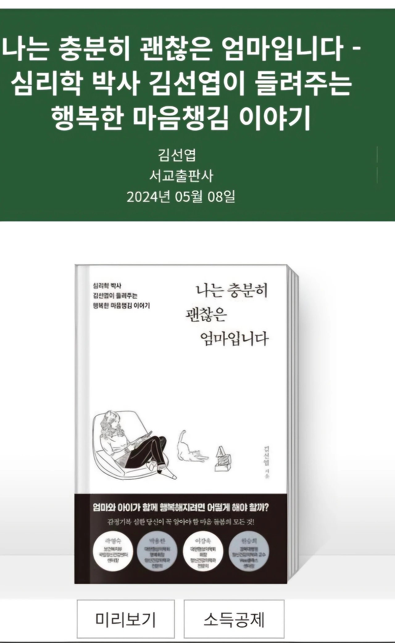 내가 가장 즐거움을 느끼는 순간은 언제인가요? 내가 가장 슬퍼지거나 화가 날 때는 언제인가요? 좋아하는 사람들과 함께 있을 때 나의 마음은 어떤가요? 나는 누구와 있을 때 가장 편안함을 느끼나요? (-76-) 마음챙김이란 현재 이 순간에 일어나고 있는 경험들에 대해 어떠한 판단도 하지 않고 의식적으로 주의를 집중하는 것이다. (-113-) 셋째, 나만의 공간과 시간을 찾아 스스로 격려해 보세요.하루하루를 정신없이 살아가다 보면 어느새 달력의 숫자는 달라져 있고 해가 넘어갑닉다.무엇을 위해 이렇게 바쁘게 살고 있는지, 엄마가 아닌 '나'라는 사람이 과연 존재하기는 하는지 자꾸 의문이 듭니다. 어느새 늘어난 흰머리만이 그간의 고된 시간을 보여 주는 듯합니다.만약 여러분이 이런 상황에 놓여 있자면 스스로 격려하고 대접할 수 있도록 하는 것이 무엇보다 중요합니다. (-146-)