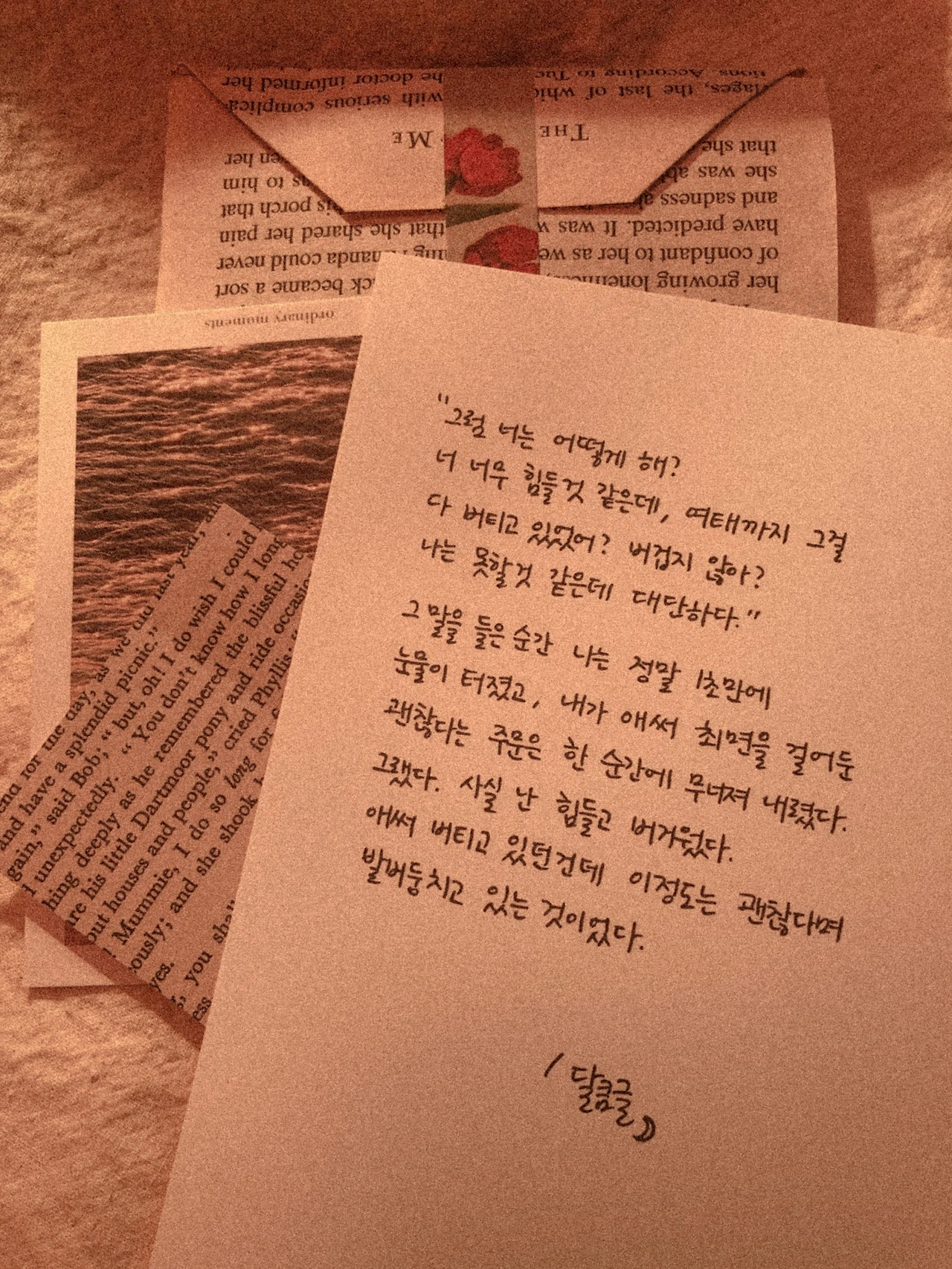 하지만 지금 돌아보면 그것은 모두 구조요청이었던 것 같다. 이루어지지 않음을 알면서도 나를 우울의 구렁텅이로 떠민 이 상황에서, 다들 그렇게 뻔한 위로만 건네지 말고 누구라도 내 손을 잡고 끄집어내 달라고, 내가 이렇게 죽을 것 같은데 발 벗고 나서서 나 좀 구해달라는 그러한 신호. 그러나 그렇게 되지 못함을 알고 있는 속상한 SOS. 그리고 나는 그러한 신호를 띄웠을 때 아무렇지 않게 돌아오는 너무 뻔한 위로의 말들이 너무나 괴로웠다. 힘내라는 말, 언젠간 괜찮아 질 거니까 조금만 더 버티라는 말, 너무 안 좋게만 생각하지 말고 긍정적으로 생각하라는 말. 이런 류의 말들은 어쩌면 지금의 나도 아무렇지 않게 쓸 당연한 위로의 말이지만, 사실 그 당시의 나에겐 가장 무책임한 위로의 말, 지금 당장이 힘든 내게 가장 필요없는 말로 들렸던 것 같다. 물론, 그 말을 건넨 그들에겐 진심으로 내가 괜찮아지길 바라는 마음에 했겠지만 그 말들을 하고 정작 내가 가장 괴로워하는 순간엔 내 옆에 없을 그들을 알고 있기에 더 쓸모 없는 말이라고 생각했던 것 같다.