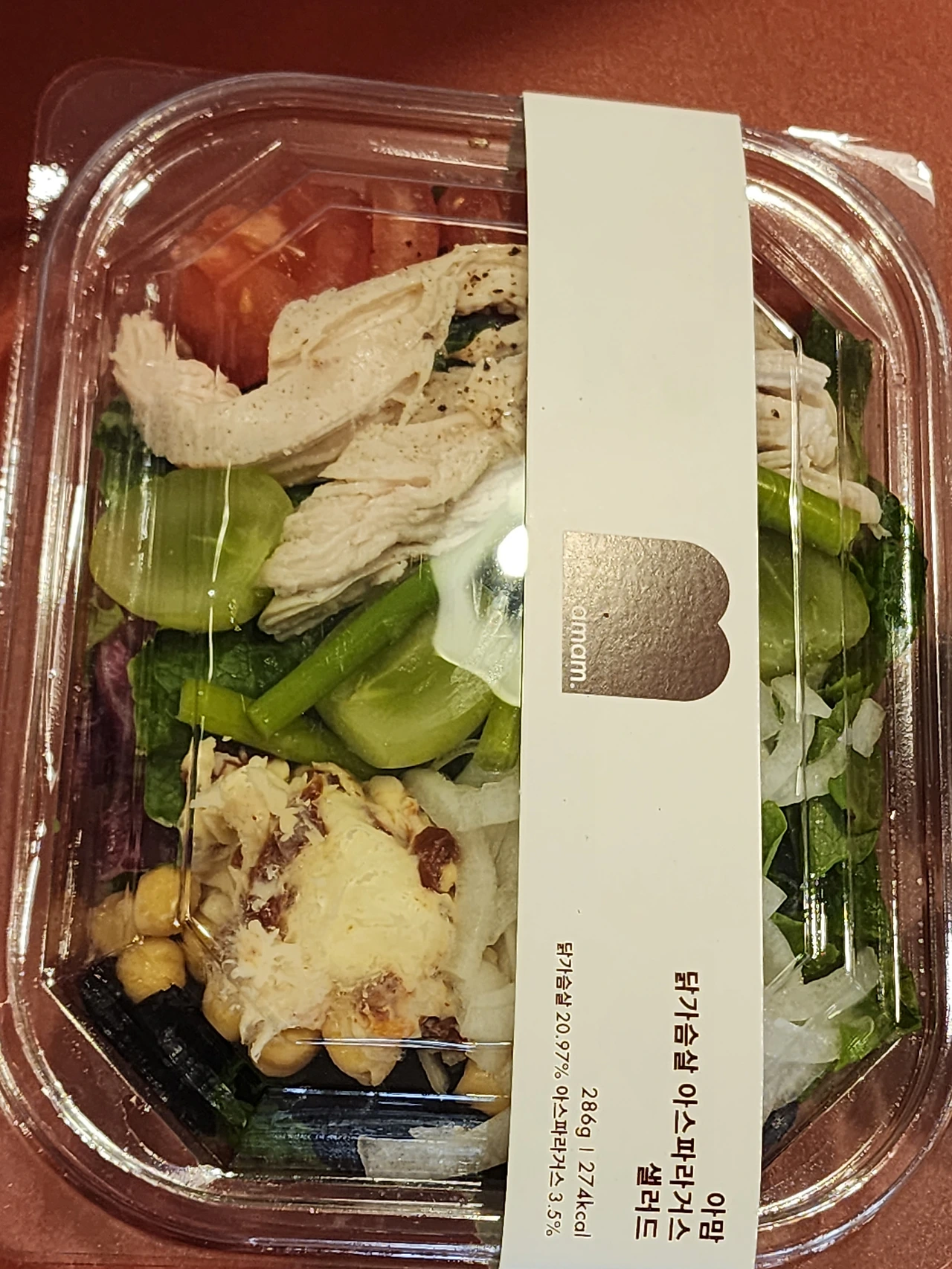 투명 비닐에 위 연어 아래 닭가슴살 아스파라거스, 색이 다른 샐러드 소스까지 두 통 담겨서 배가 고프고도 남을 그 시간에 너무나 그 사람을 유혹했을 것이다.