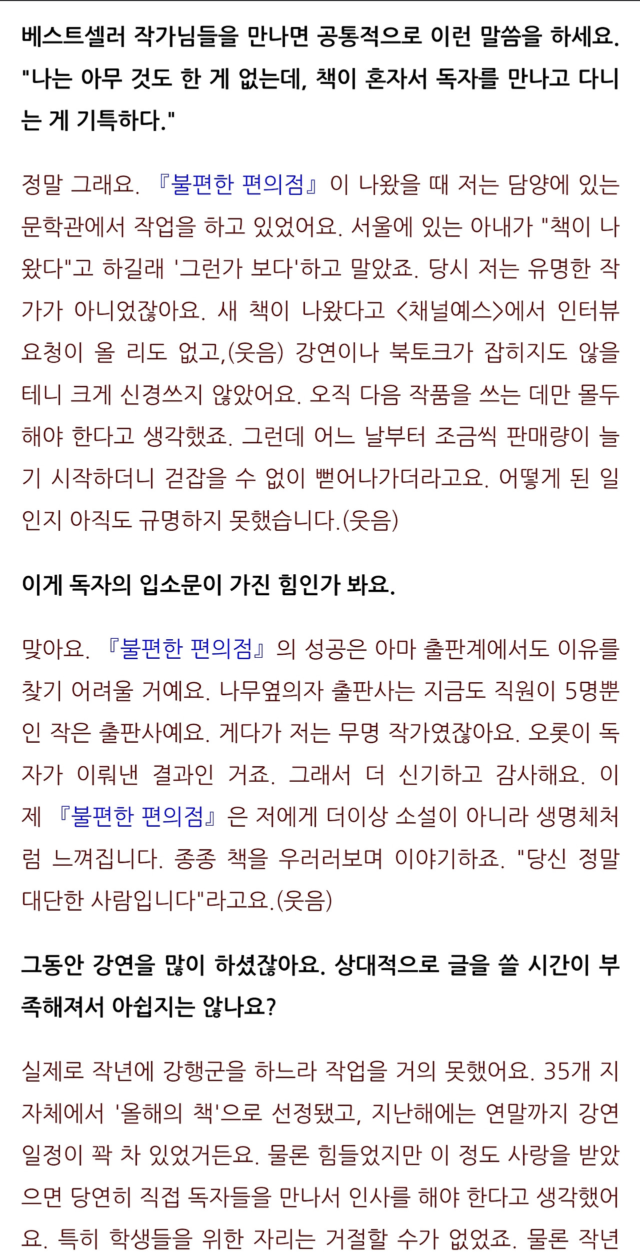 작가 본인에게도 책을 무척이나 힘들게 쓰는 시간들 사이에는 감히 예상하지 못한 폭발적인 반응이었을 거다. 작품이 나오고 나서 내 손을 떠나 잘 여행하고 있는 아끼는 것을 바라보며 이게 꿈인가 실감이 안 날지도 모르겠다 싶은, 인생에 자주 찾아오지는 않는 놀라운 사건이겠다는 마음이 잘 느껴졌다.