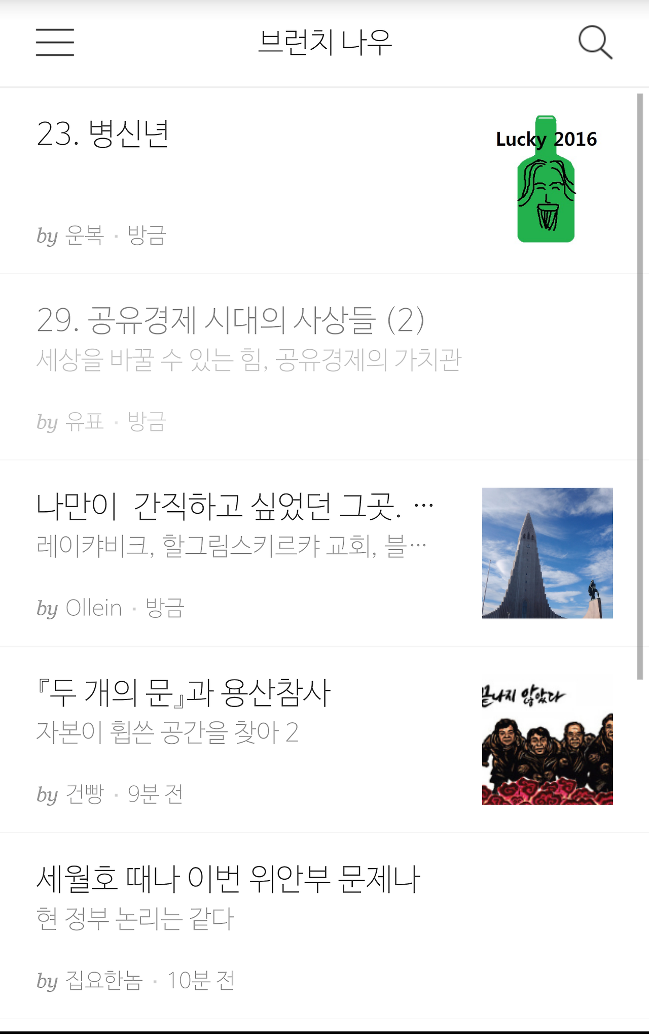 ; 브런치 나우에 최신 글 목록이 제목/부제목으로 리스트로 되어 있어서 글의 매력이 드러나지 않음. 사진이 없으면 더 없어 보임.