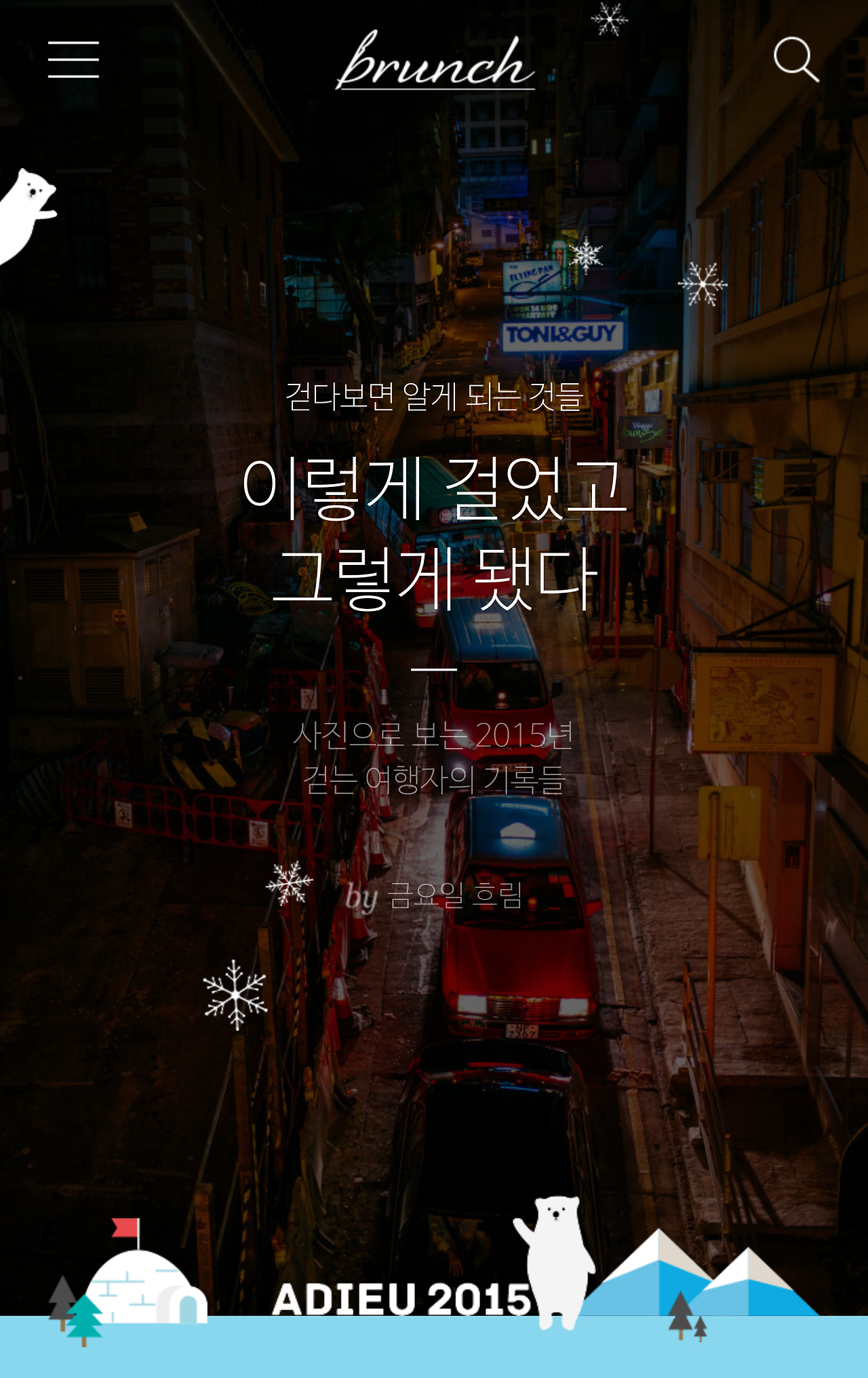 브런치홈이 눈이 날리고 귀여운 캐릭터로 메이크업되어 표시되는 것과 극명히 대비됨