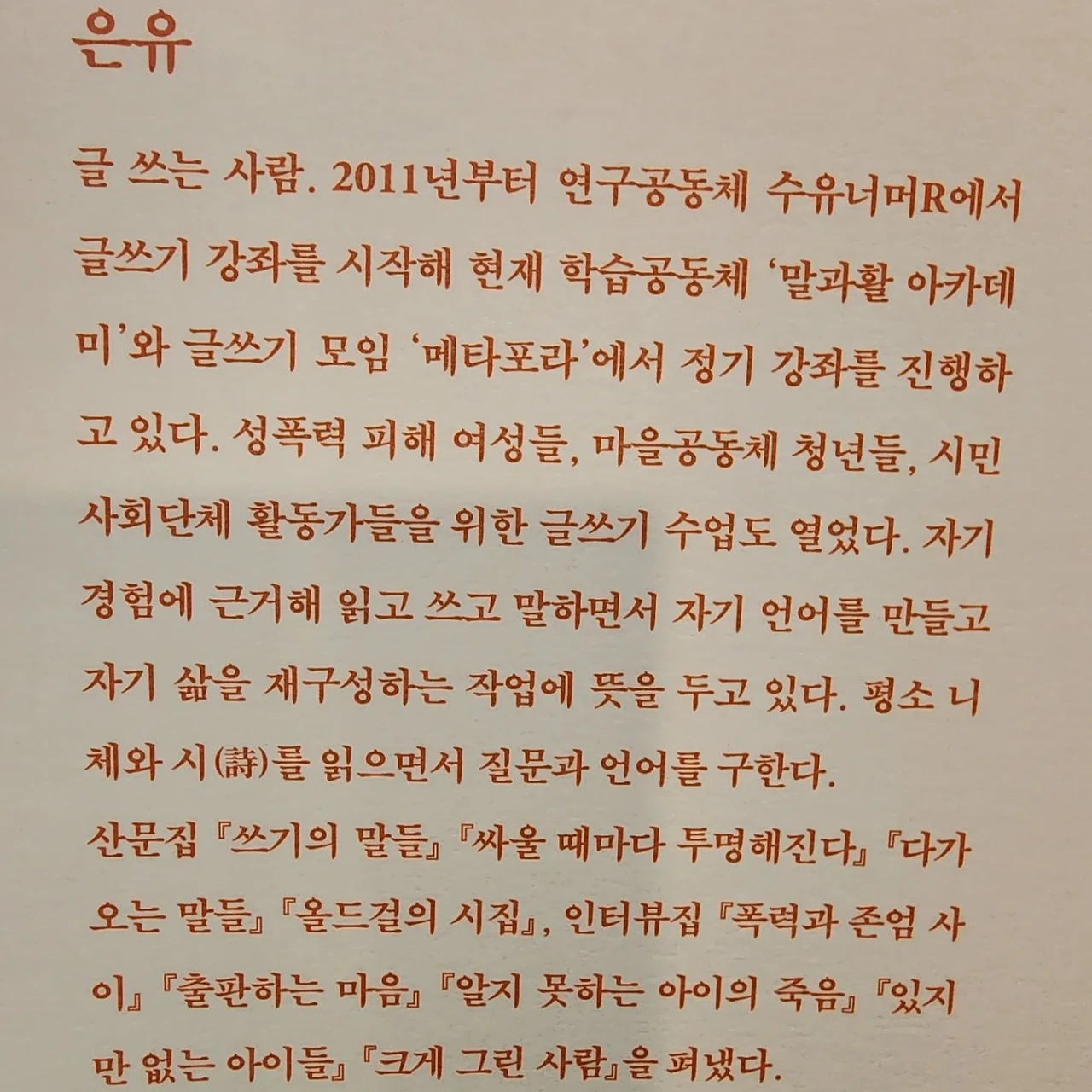 글쓰기는 서사의 편집권을 갖는 일이다. 한 사람을 악마로 천사로도 만든다. 그러나 작가는 심판관이 아니다. 글쓰기를 통해 자기 자신을 포함해 한 사람의 다른 면을 발견하려는 노력이 글을