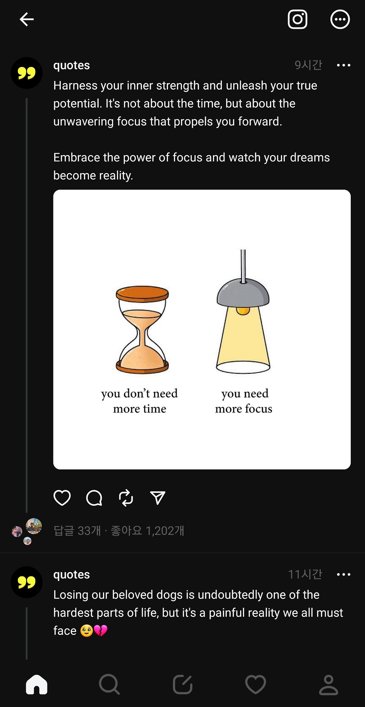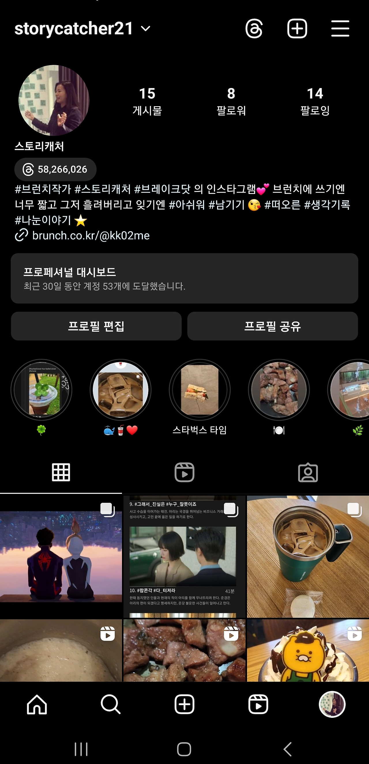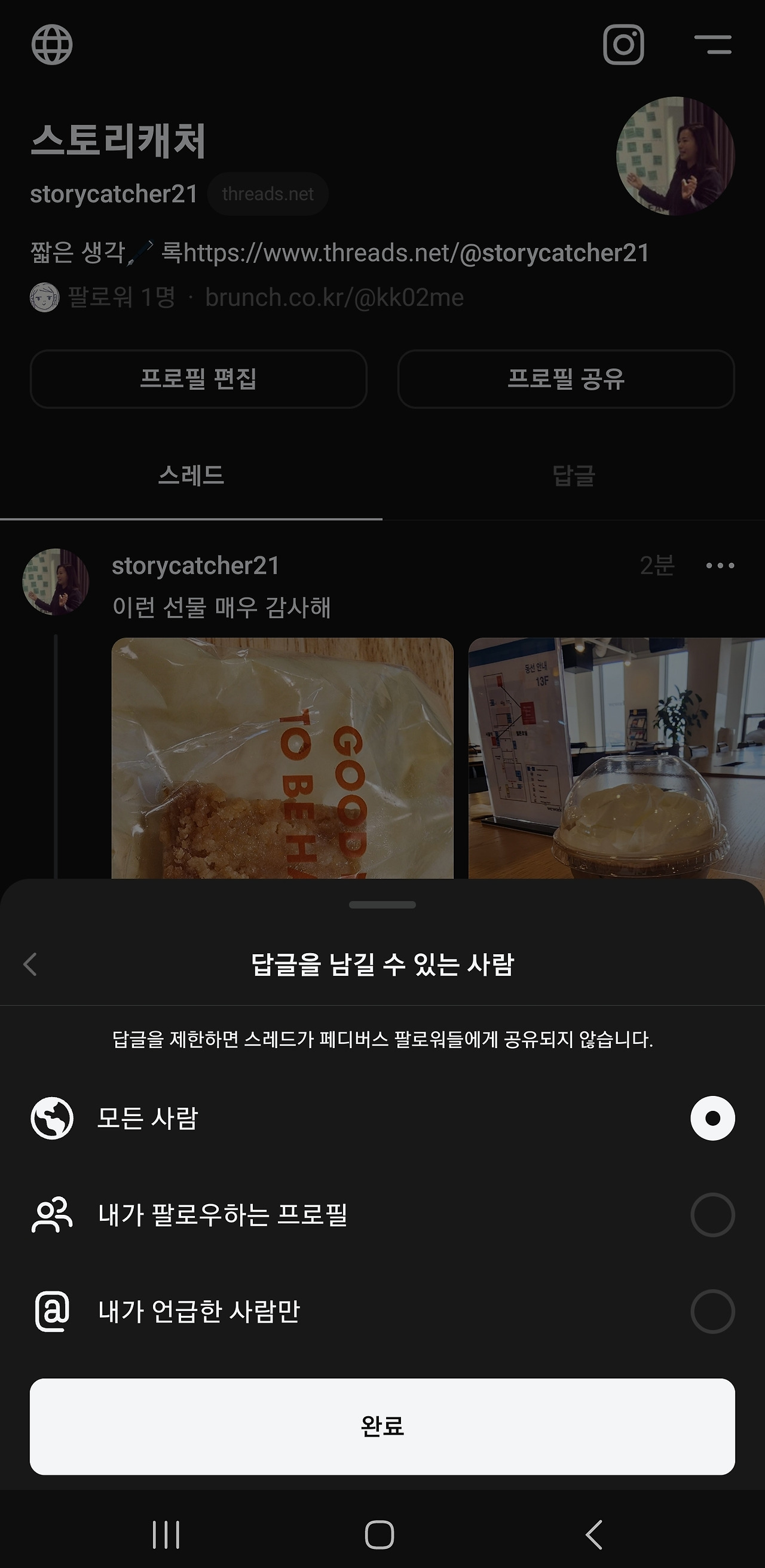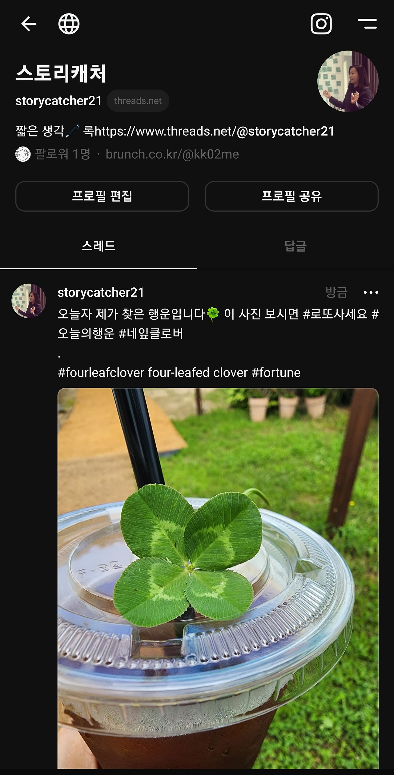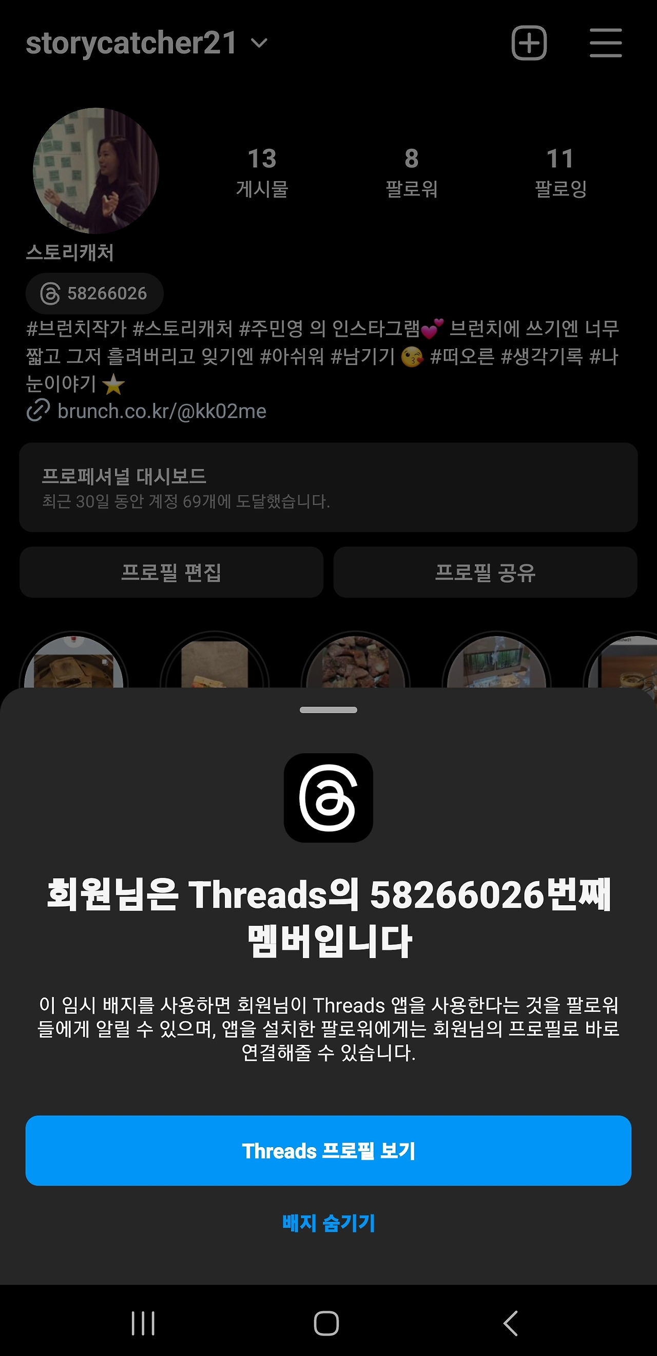 인스타그램 프로필 오른쪽에도 바로 스레드로 가는 바로가기 버튼이 생겼다.