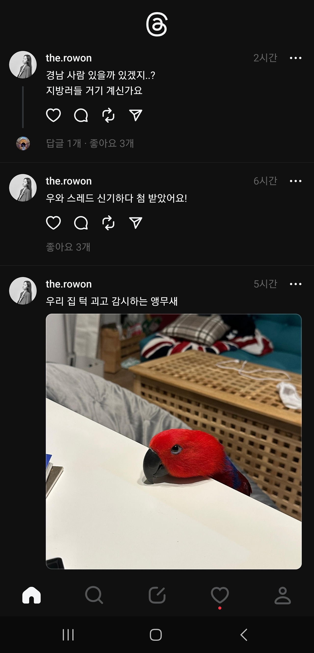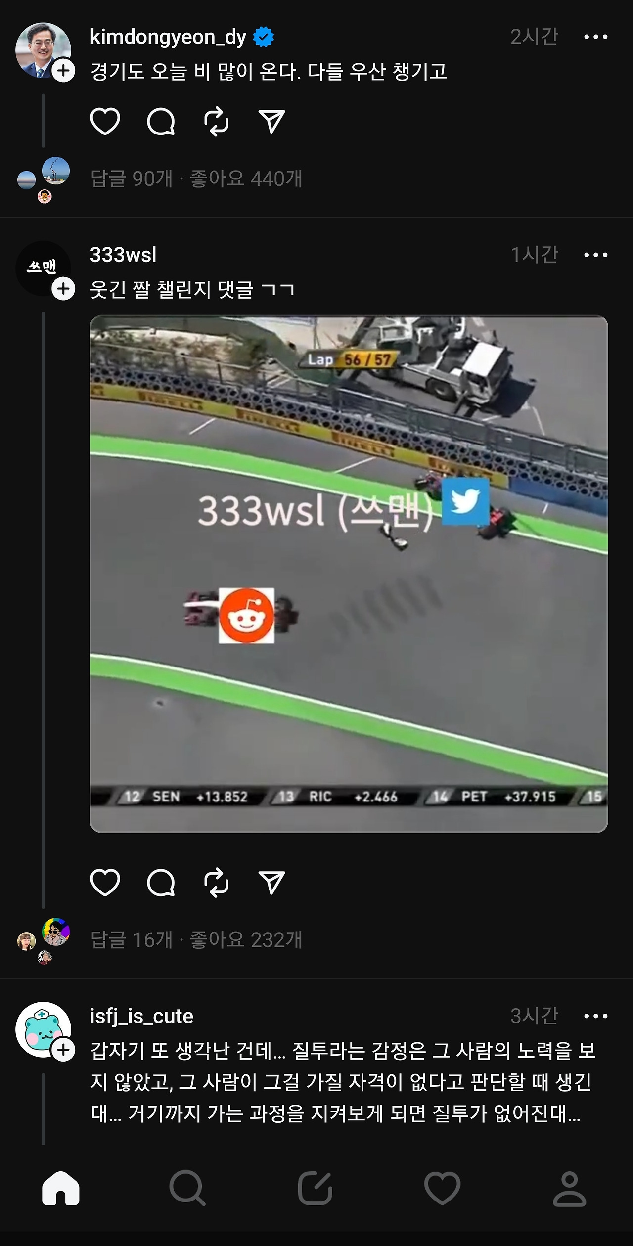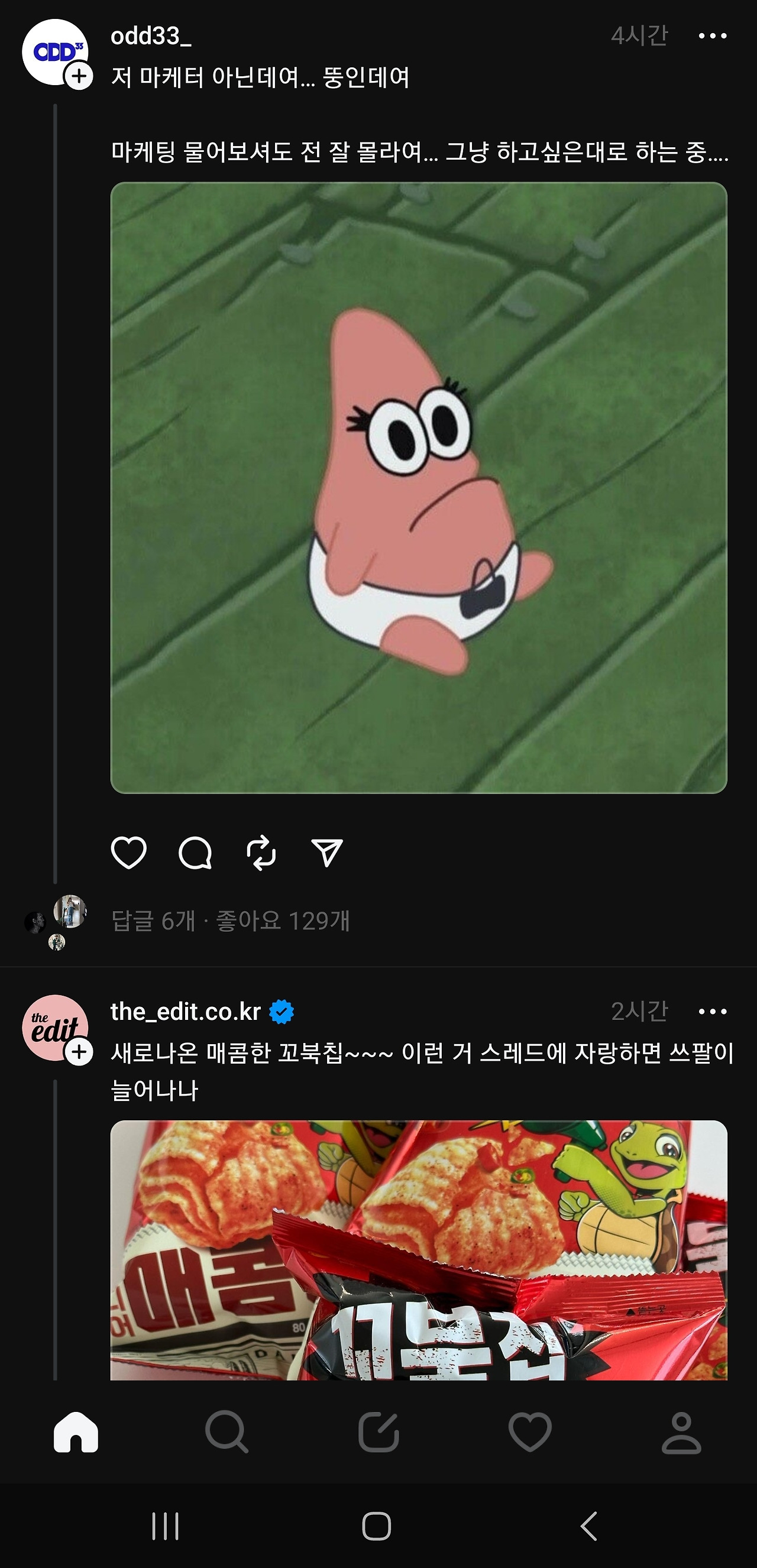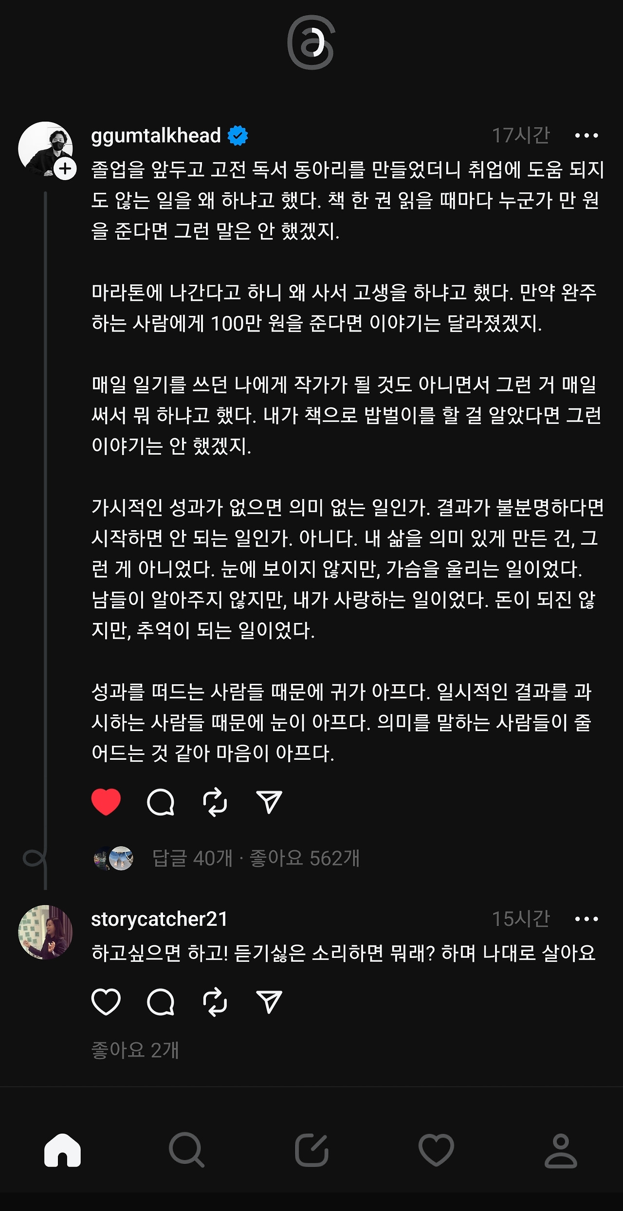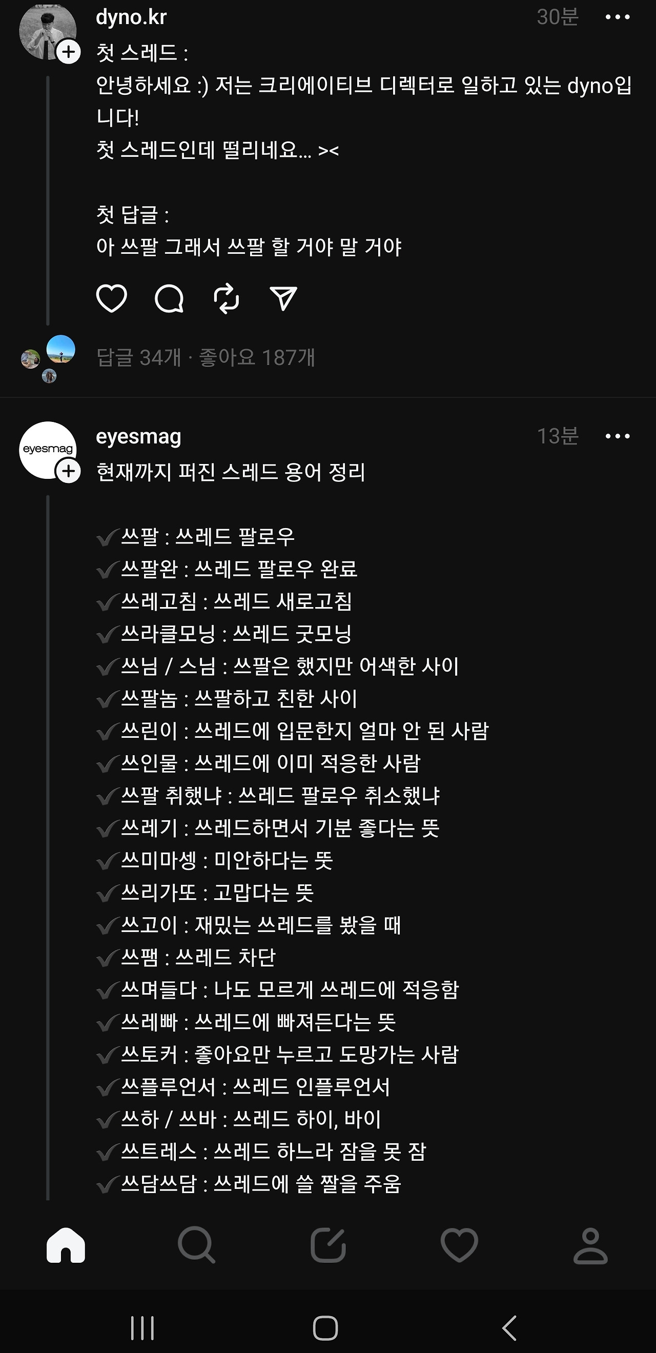사람들이 북적이고 모여야 잘 이어나갈텐데, 주커버그가 문을 닫지 않는한 '실' 처럼 가늘고 길게 장수할 것처럼 보인다. 글타래라고 불리기도 했던 threads , 스레드 시스템은 게시글 본문이나 댓글이 동일해서, 댓글도 본문과 같은 방식으로 쓸 수 있는데 익숙하지 않아 조금 어색하고, 보기에 따라서는 어수선하고 더 복잡해 보일 수도 있다. 그냥 모르는 사람들의 난데없는 '아무말 대잔치' 같다고 생각하고 입장하면 된다.