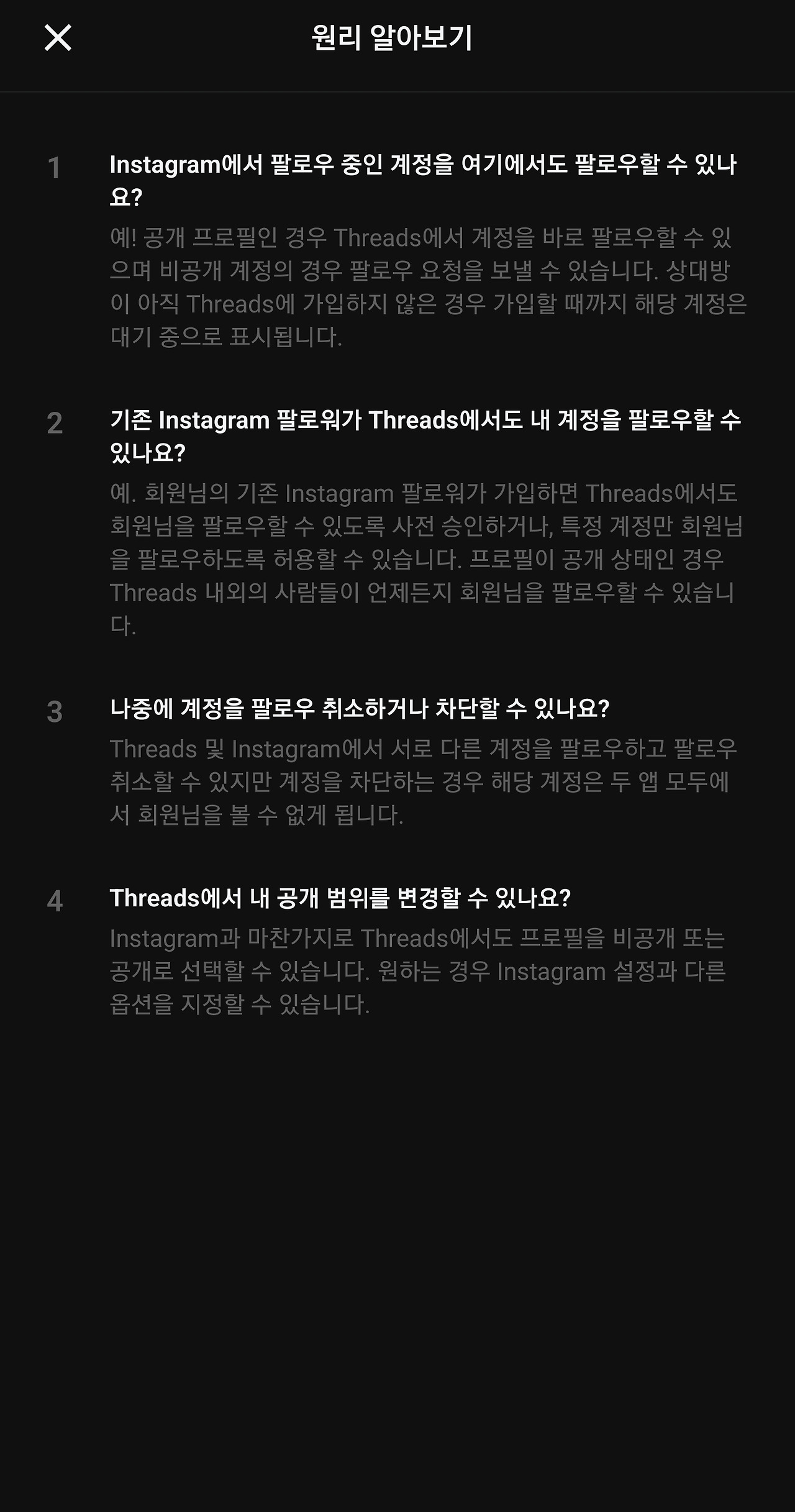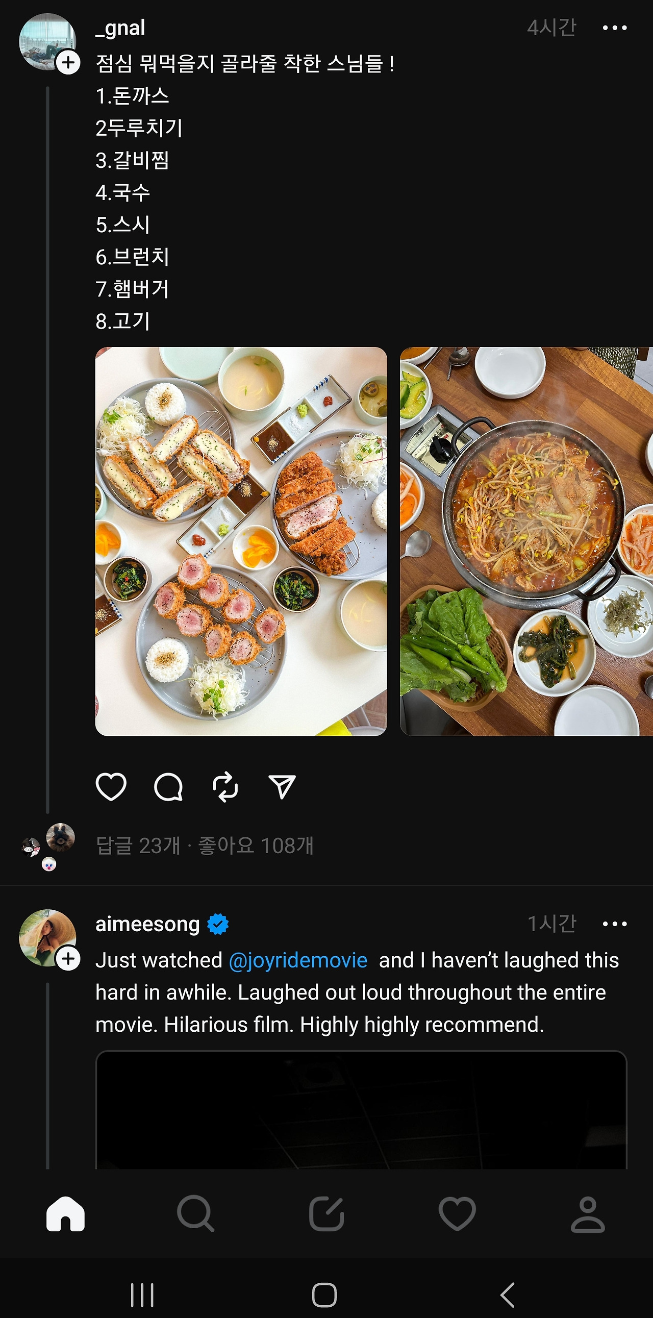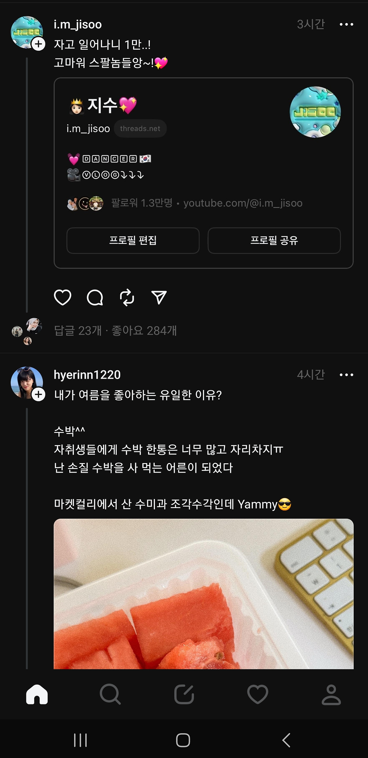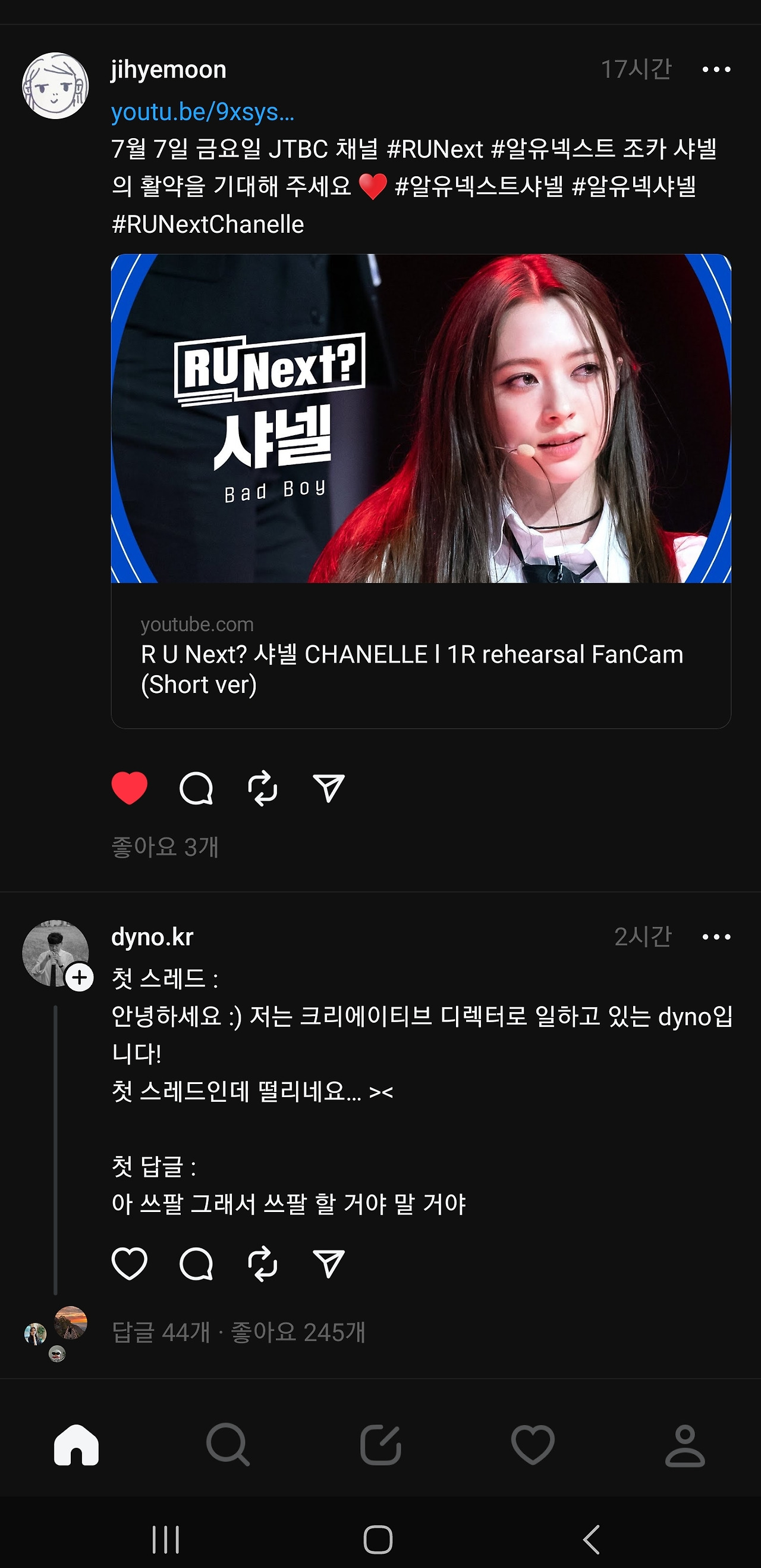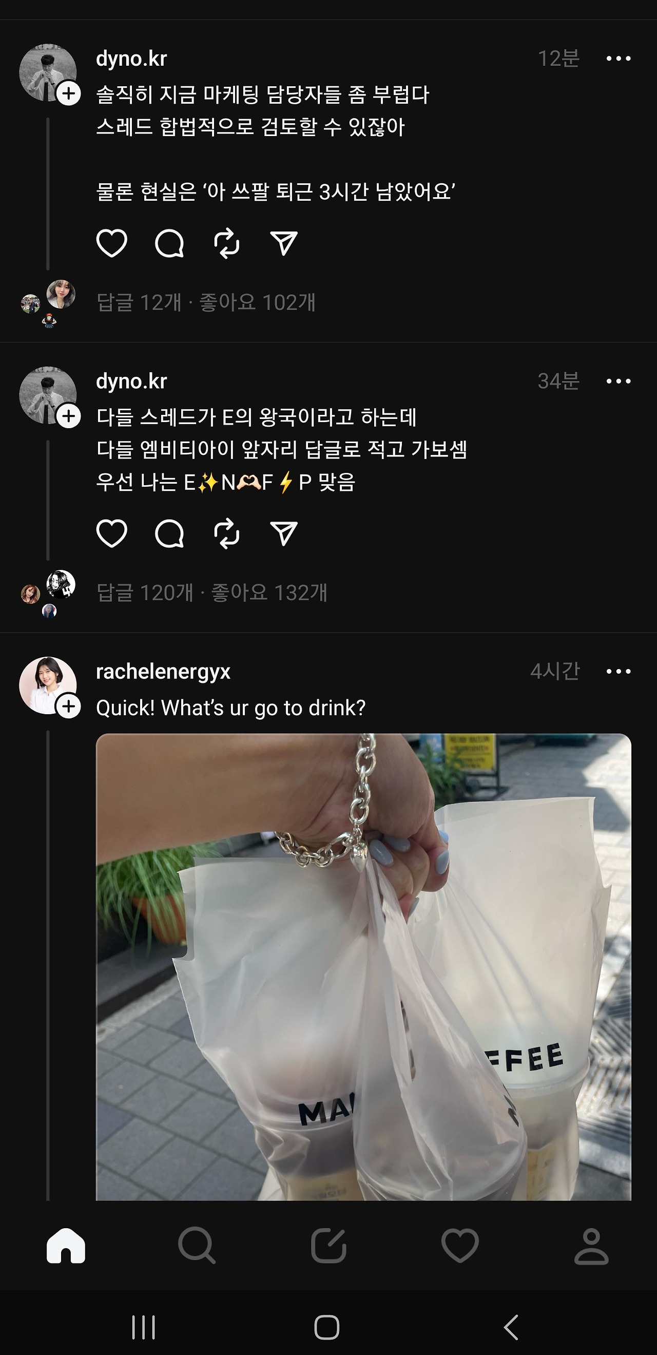 사람들이 북적이고 모여야 잘 이어나갈텐데, 주커버그가 문을 닫지 않는한 '실' 처럼 가늘고 길게 장수할 것처럼 보인다. 글타래라고 불리기도 했던 threads , 스레드 시스템은 게시글 본문이나 댓글이 동일해서, 댓글도 본문과 같은 방식으로 쓸 수 있는데 익숙하지 않아 조금 어색하고, 보기에 따라서는 어수선하고 더 복잡해 보일 수도 있다. 그냥 모르는 사람들의 난데없는 '아무말 대잔치' 같다고 생각하고 입장하면 된다.