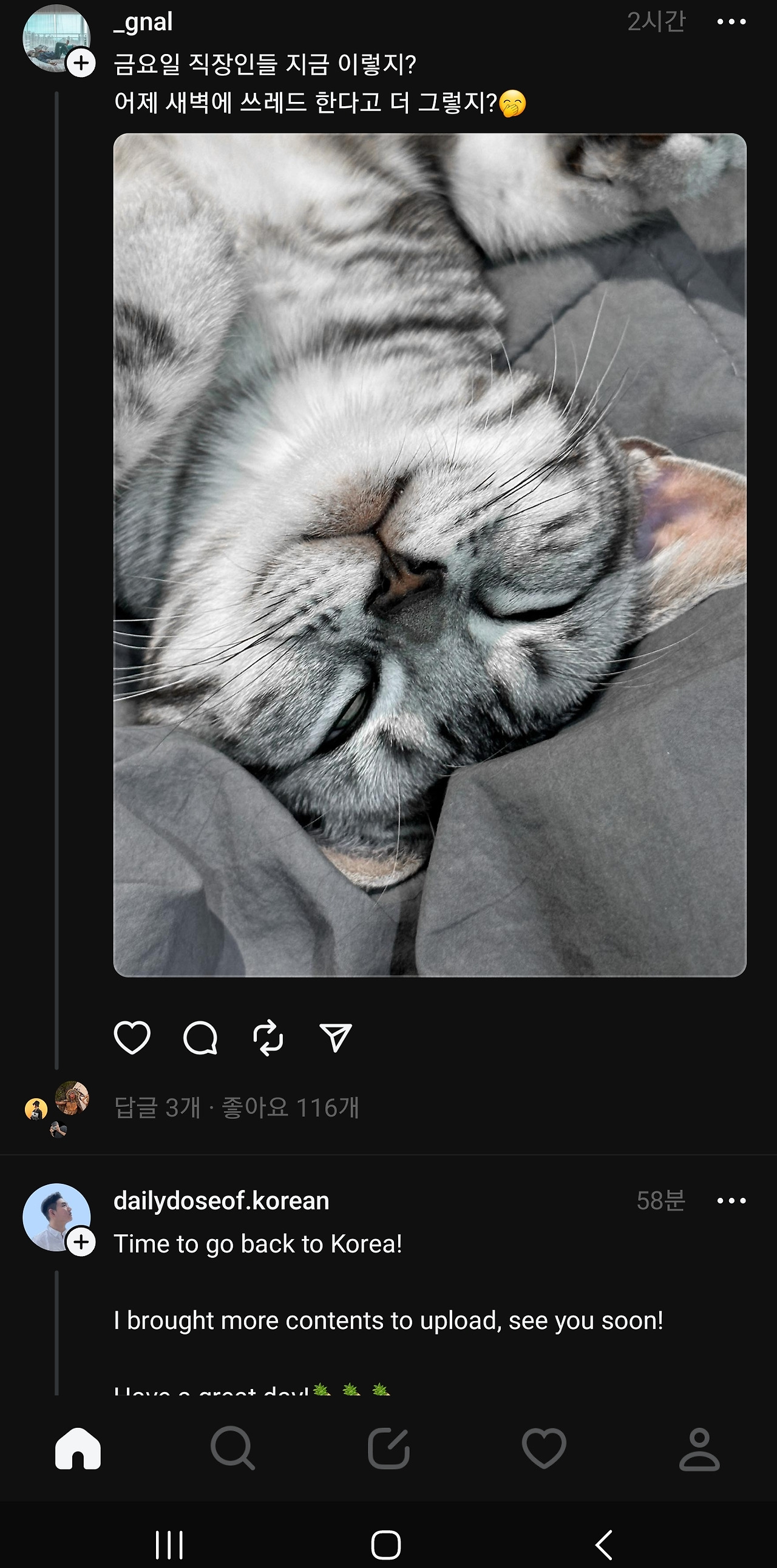스레드에서 고양이 사진만 계속 좋아요 눌렀더니 다음 접솤했을 때도 귀여운 고양이 짤이 계속 나를 반겨준다.