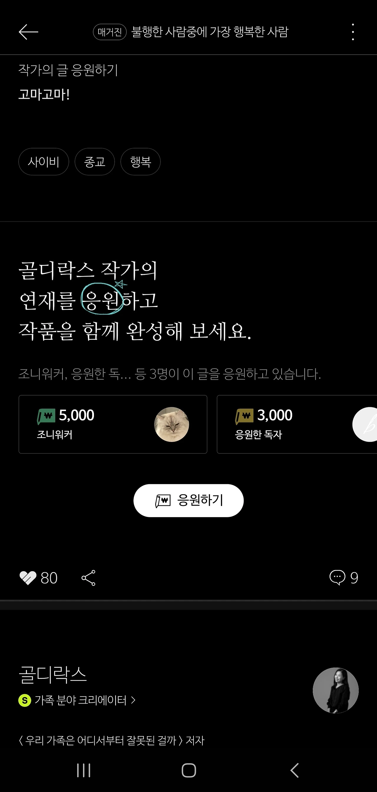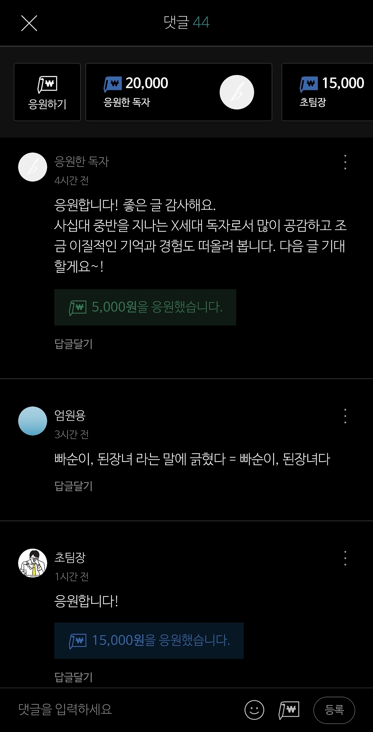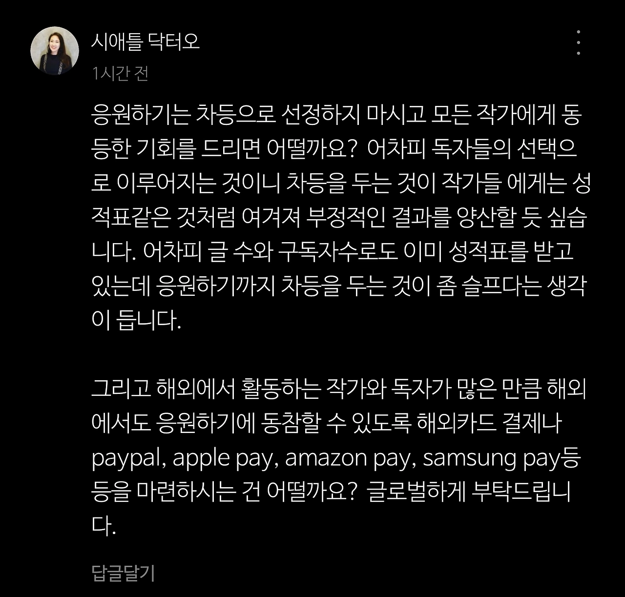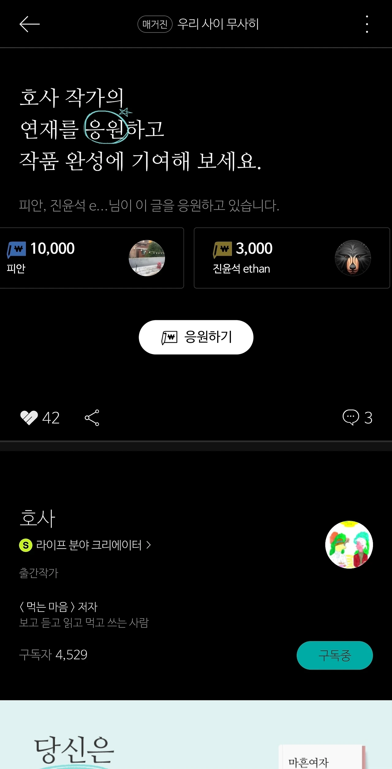 그 작가가 매주 좋은 글을 써줘서 무척 고맙고, 지갑을 열어서 연재를 응원하는 건 구독자보다는 작가의 팬일테고, 팬을 결집시켜보려는 목적이 보인다.