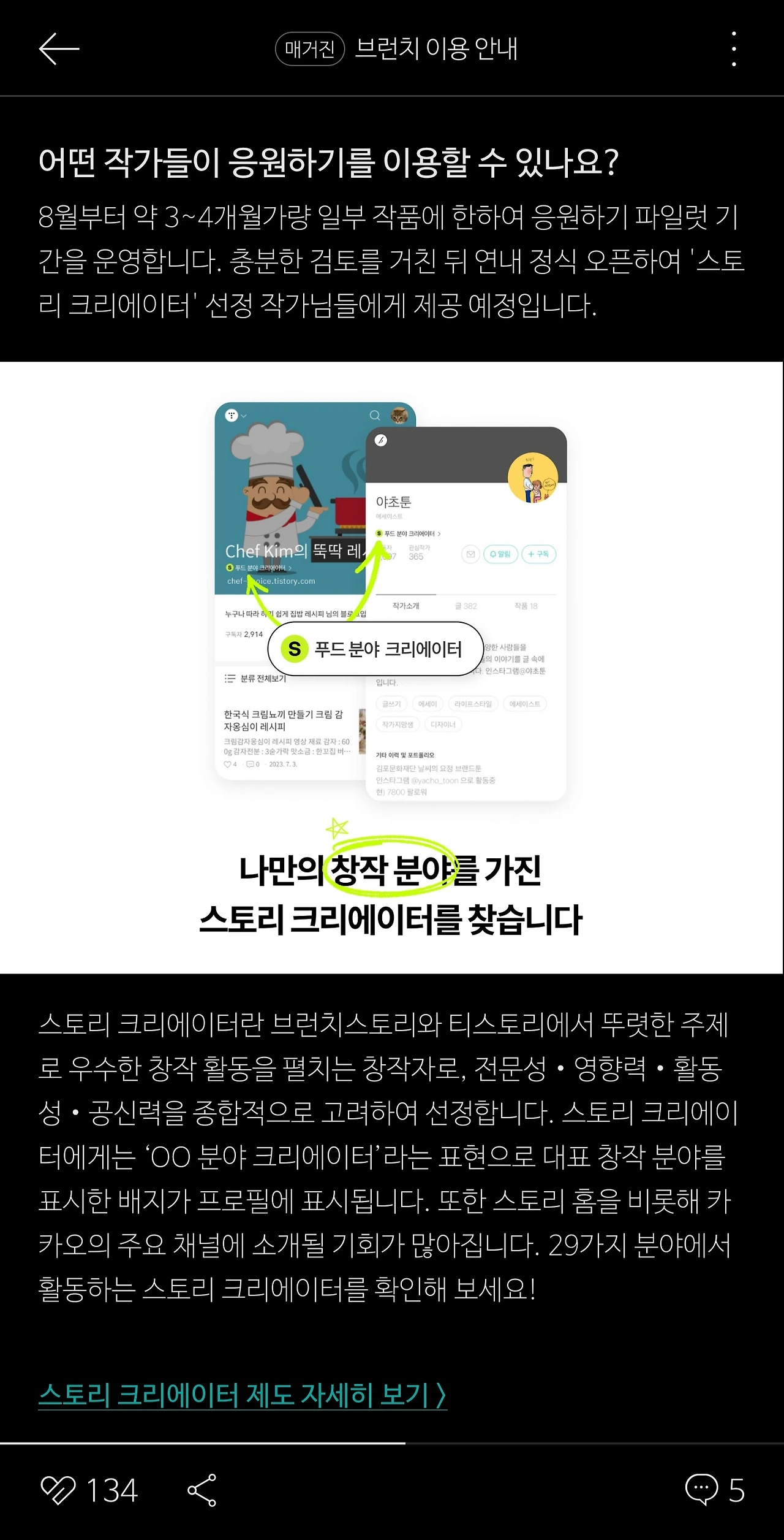 그리고, 브런치 내에서는 가끔 글을 올리지만, 워낙 유명해 응원하기를 많이 받을 법한 분들에게는 선정 자격에 나열된 기준에 부합'하지 않더라도 프리패스 응원하기 버튼을 준 것도 이 분들에게 브런치 활동을 많이 하라는 동기부여이자 당근인 셈이다. 애써 새로운 판을 깔아준 브런치에게는 의당 고마울 일이다.