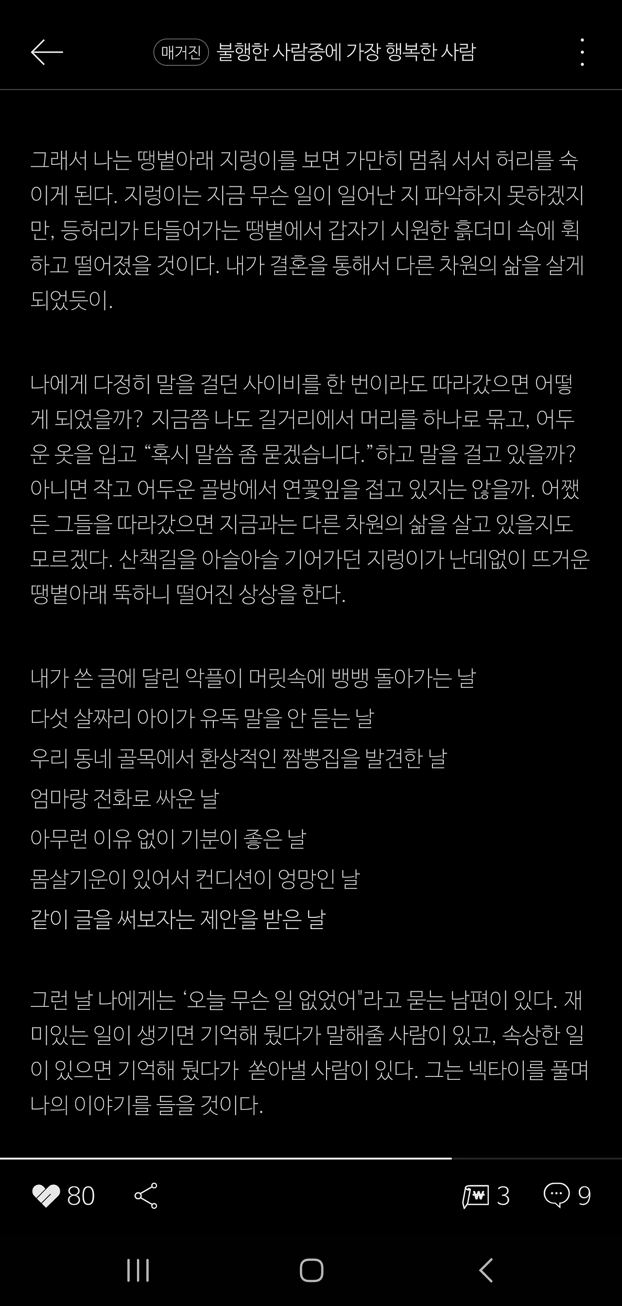 순수하게 일기 쓰듯 쓰는 나같은 사람은 관전인데, 진심으로 하는 분들이 마음이 잠시 다치신 듯 하고, 그럼에도 불구하고 글로 치유하는 모습을 보여주신다. 나도 나 스스로 상처를 다독이는 방편으로 책을 읽고, 이런 글을 가끔 쓴다.
