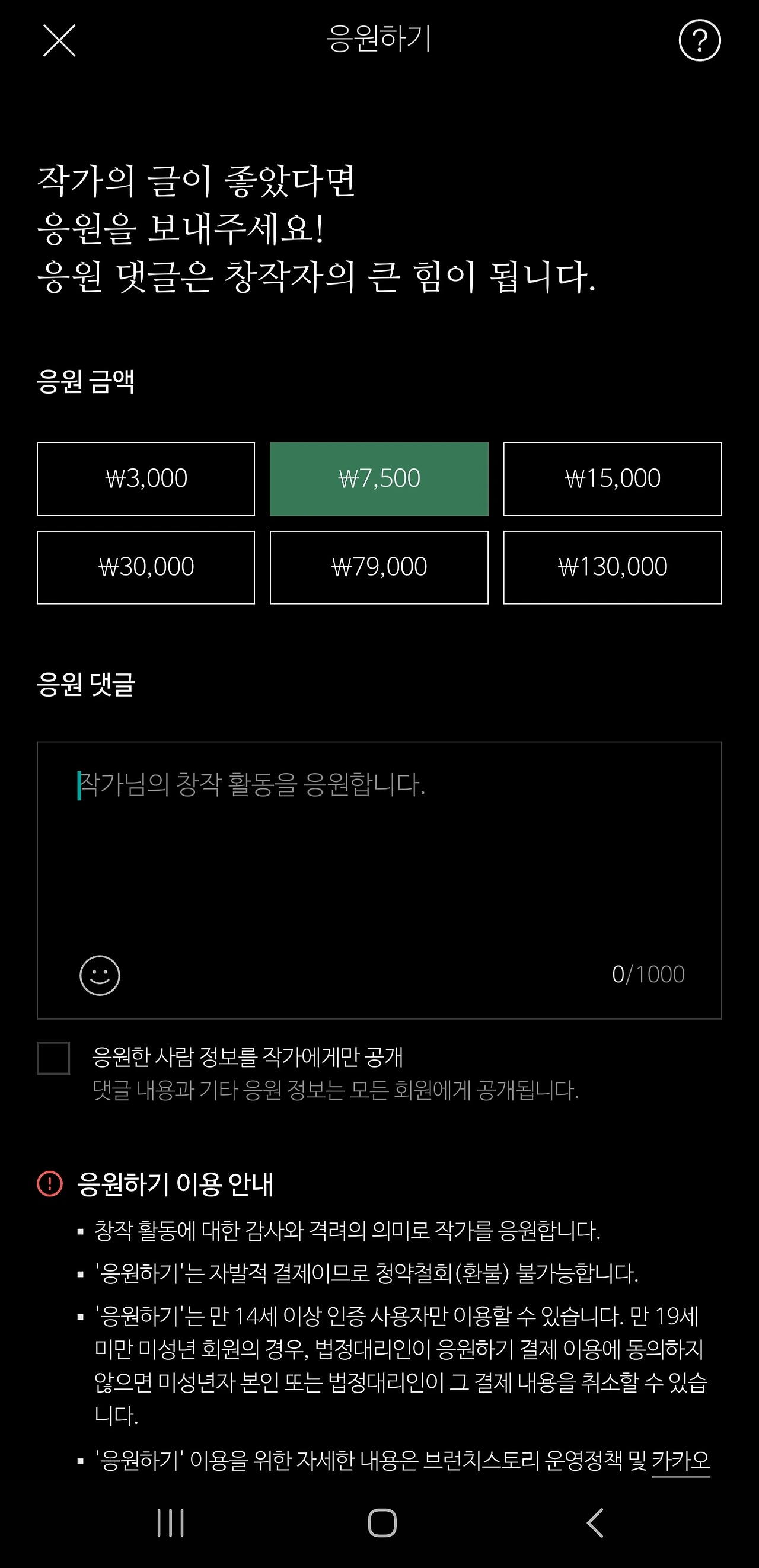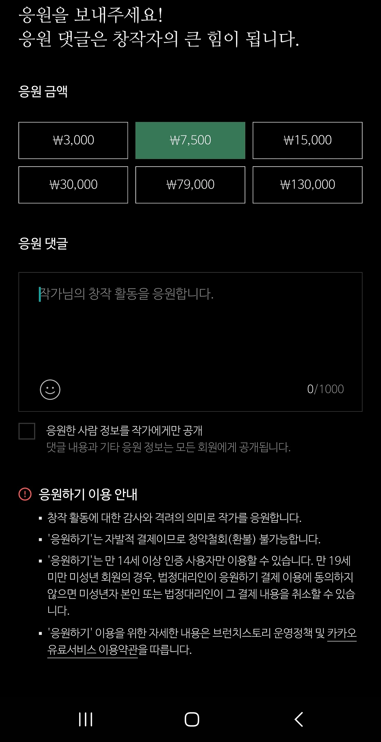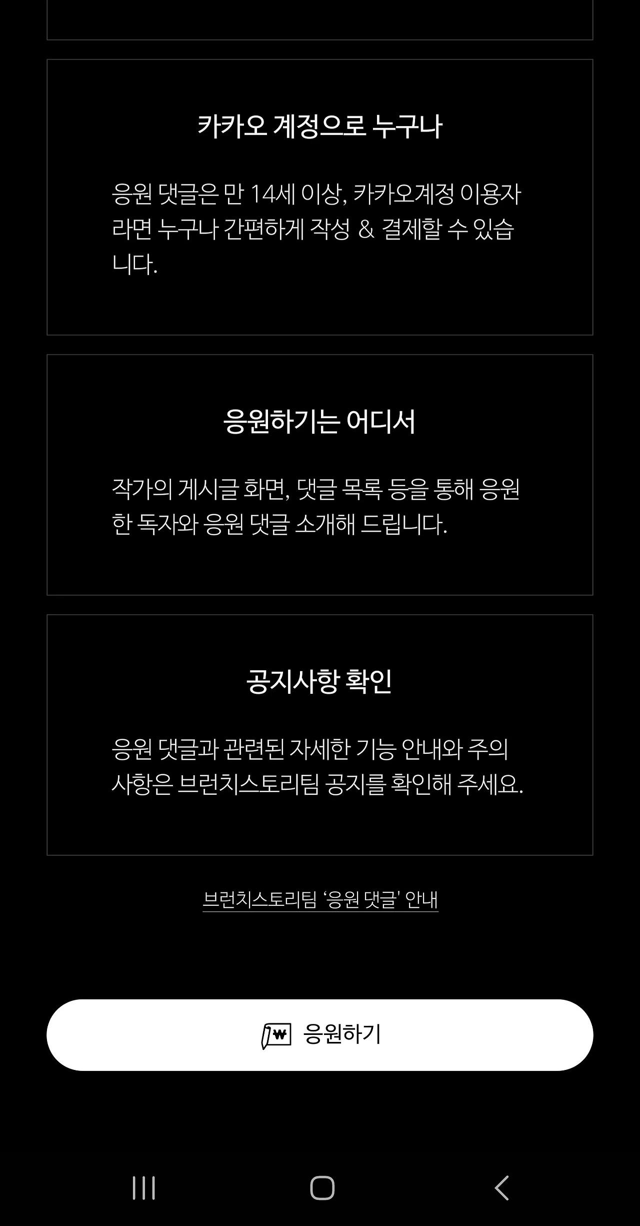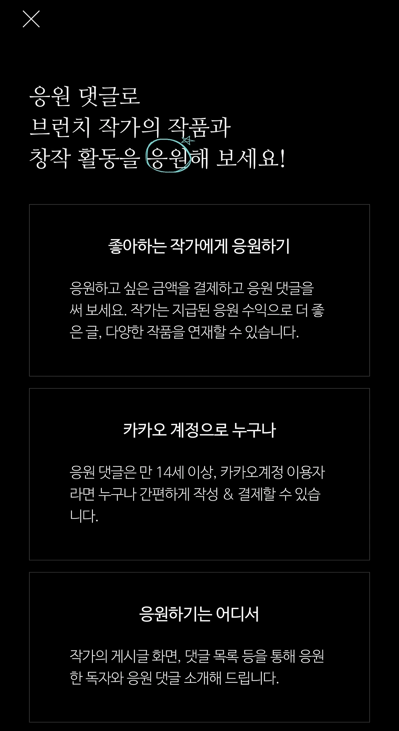 작가만 보이게 '숨은 응원'을 보낼 수도 있지만, 오전에 슬쩍 공지와 링크를 잠시 살펴보니 '** 닉네임** 1만원 응원하기 댓글이 큼지막하게 적나라하게 디자인된 것도 좀 과하지 않나 싶고, 조금 보기가 불편했다는 솔직한 의견을 남긴다.