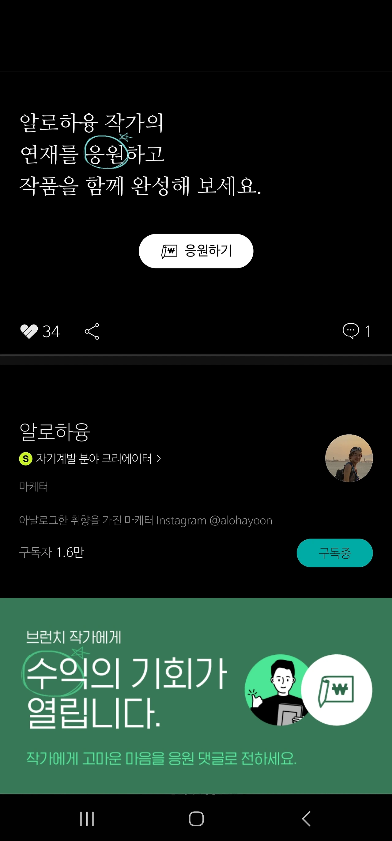 전반적인 서비스 문구가 작가와 응원하는 사람을 구분지었는데, 이 곳은 대체로 스스로 창작자라고 생각하면서 활동하기에 다른 플랫폼이 조금 결이 다른 느낌이 있다.