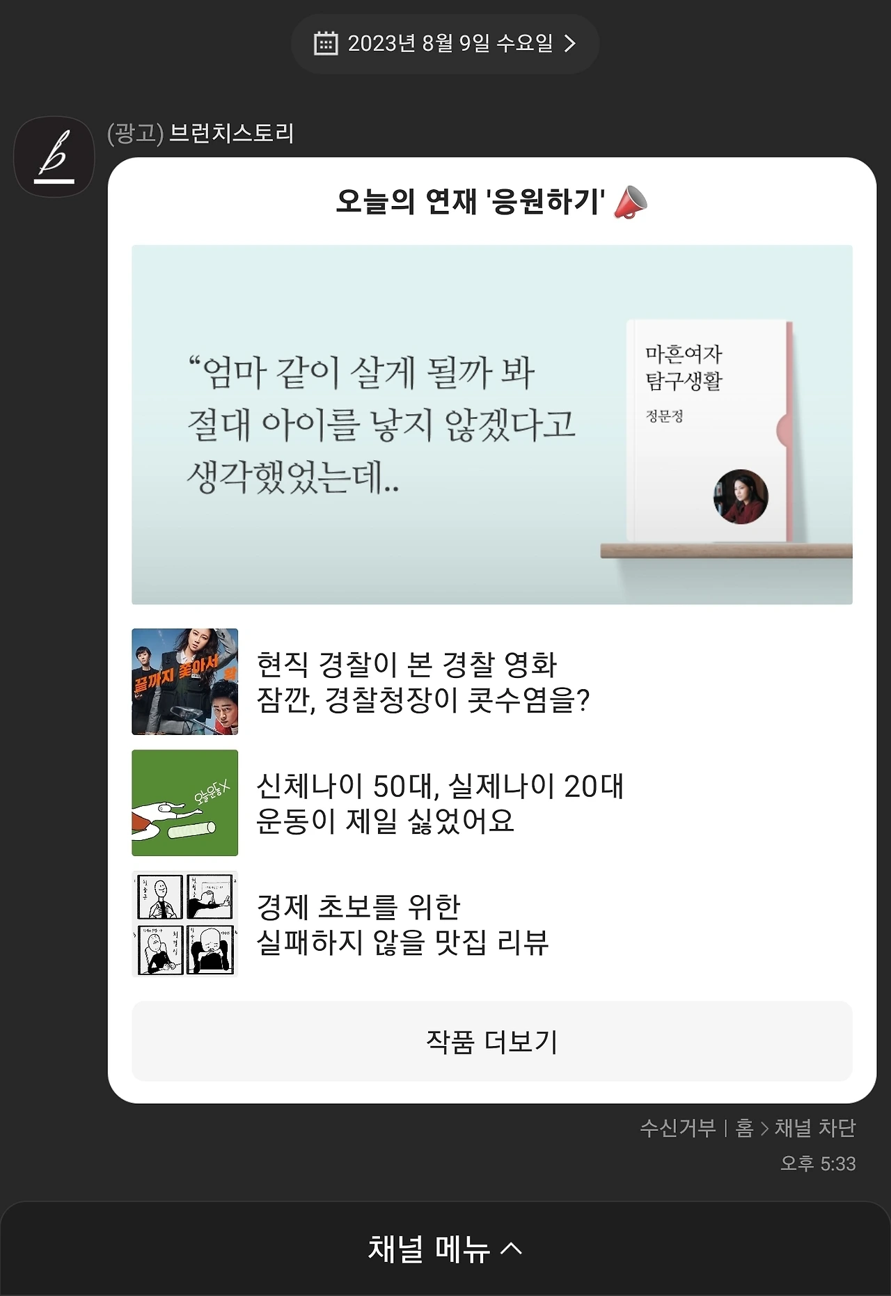 글쓰기는 운동과도 같으니 2주만 글을 안 올려도 어서 글을 쓰라고 알림으로 독려해주는 브런치가 마치 영역별로 다른 사람처럼, 기존과는 조금 다른 온도로 느껴진다. 여러 사람이 만드는 서비스여도 중심이 잡혀있으면 같은 결이 느껴질텐데(톤앤 매너) 서비스가 커져서, 서로 업무자끼리 별 대화 없이 각자 알아서 바쁘게 쳐내는 식의 분업을 하는 듯하다.