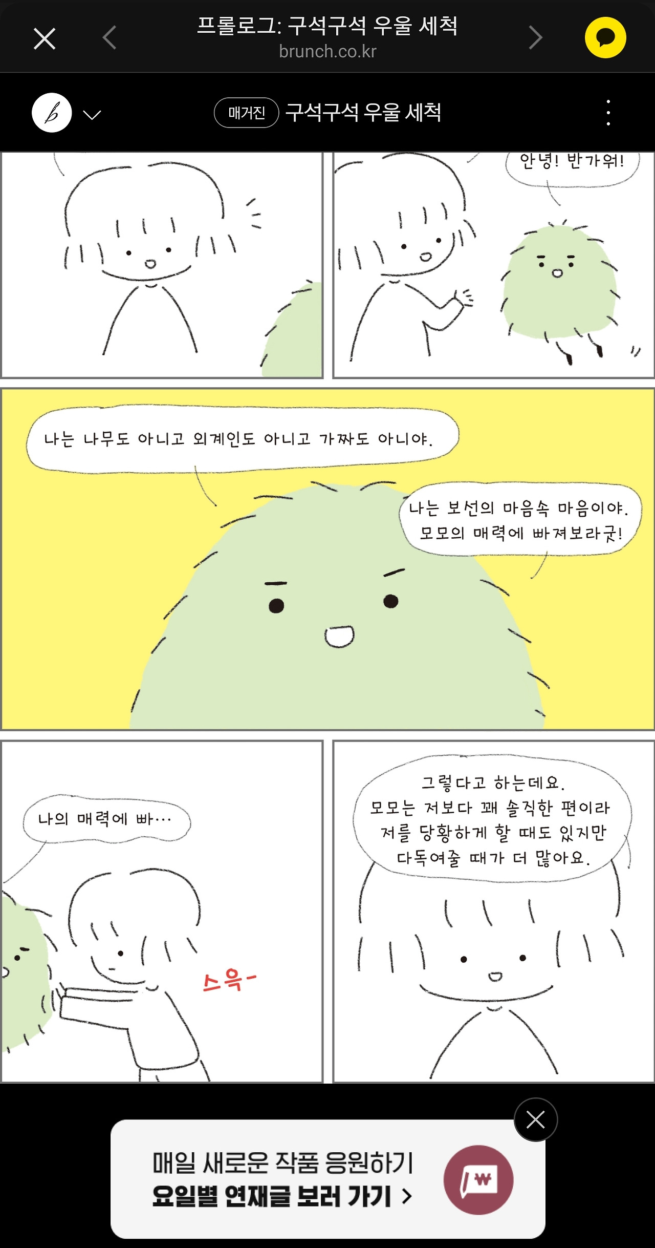 돈으로 팔로워를 단 번에 확 늘리는 현질 익스프레스 웨이가 있는 인스타그램과 달리 금전적인 방법이 전혀 없는 것으로 알려진 조용히 힘이 센 작가들의 브런치에서 이렇게 많은 관심을 받아보기는 처음이다.