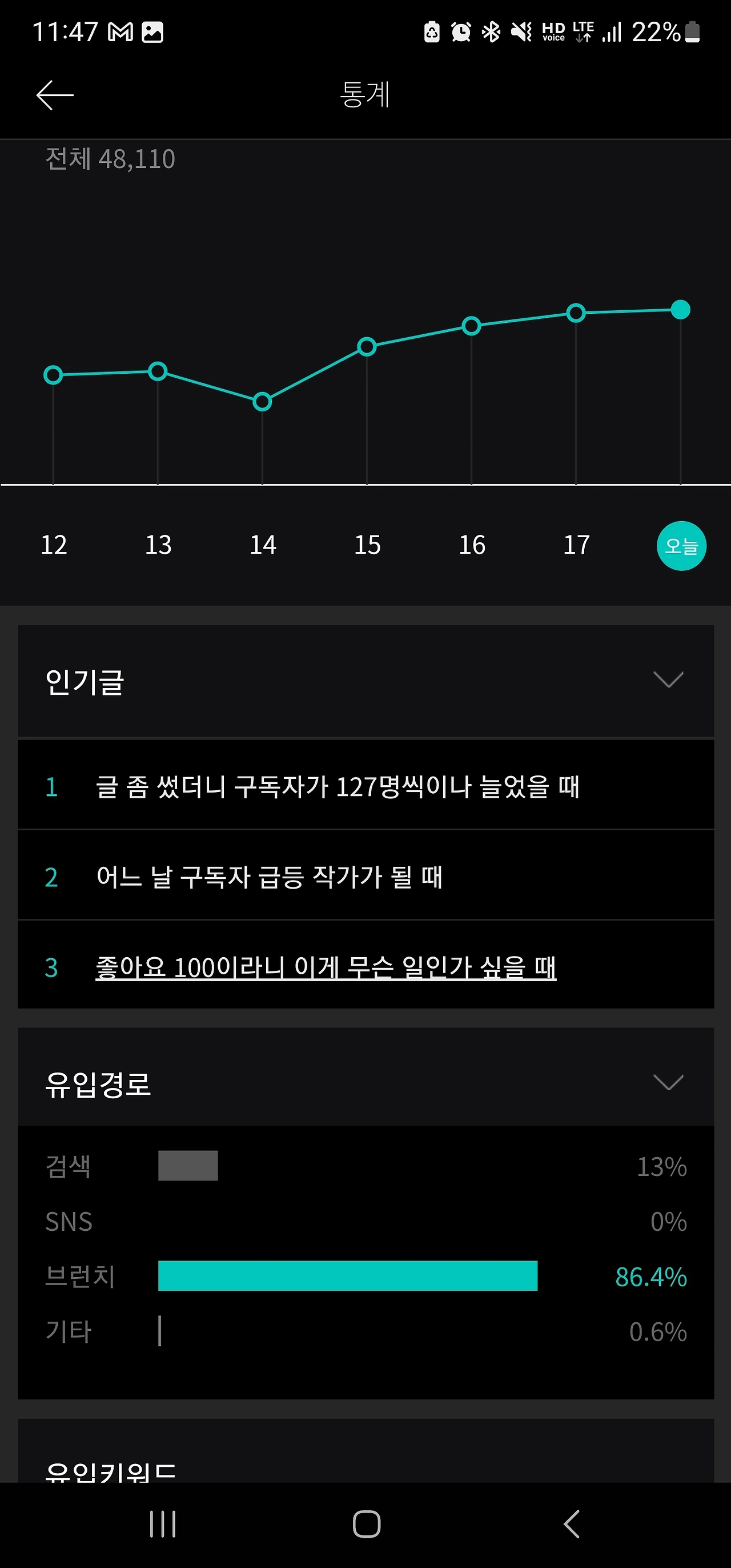 그런데, 요 근래 그래프가 심상치 않다. 매일 조회수가 오른다. 가벼운 글을 짧게 자주 발행하는 것과 더불어 꾸준히 열독해주시는 구독자가 모이니, 꾸준히 일 조회수 지표의 점을 선으로 이어 만든 그래프가 우상향이다.