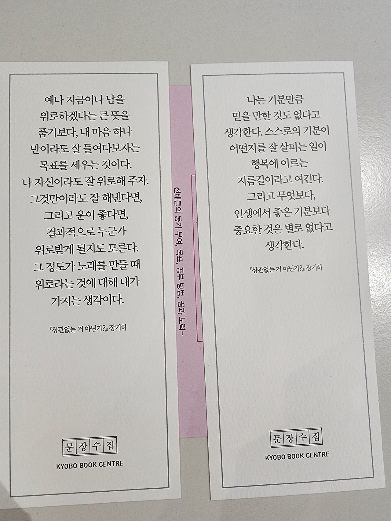 문장수집에 진심은 아닌데, 2가지만 골라서 가져가라고 해서 오래 들여다보고 아래 2장을 뽑았다.사실 처음에는 누워있는 책갈피를 다 가져가도 되는 줄 알고 이 것 저 것 많이 손에 쥐었다가 세로 판넬에 작게 써 있는 '1인당 2장'을 나중에 보고 (그 안내를 나중에 본 것을 원망하며) 다 원래 자리로 고이 돌려놓고 나서 최종적으로 내 손에 남은 두 장이다.