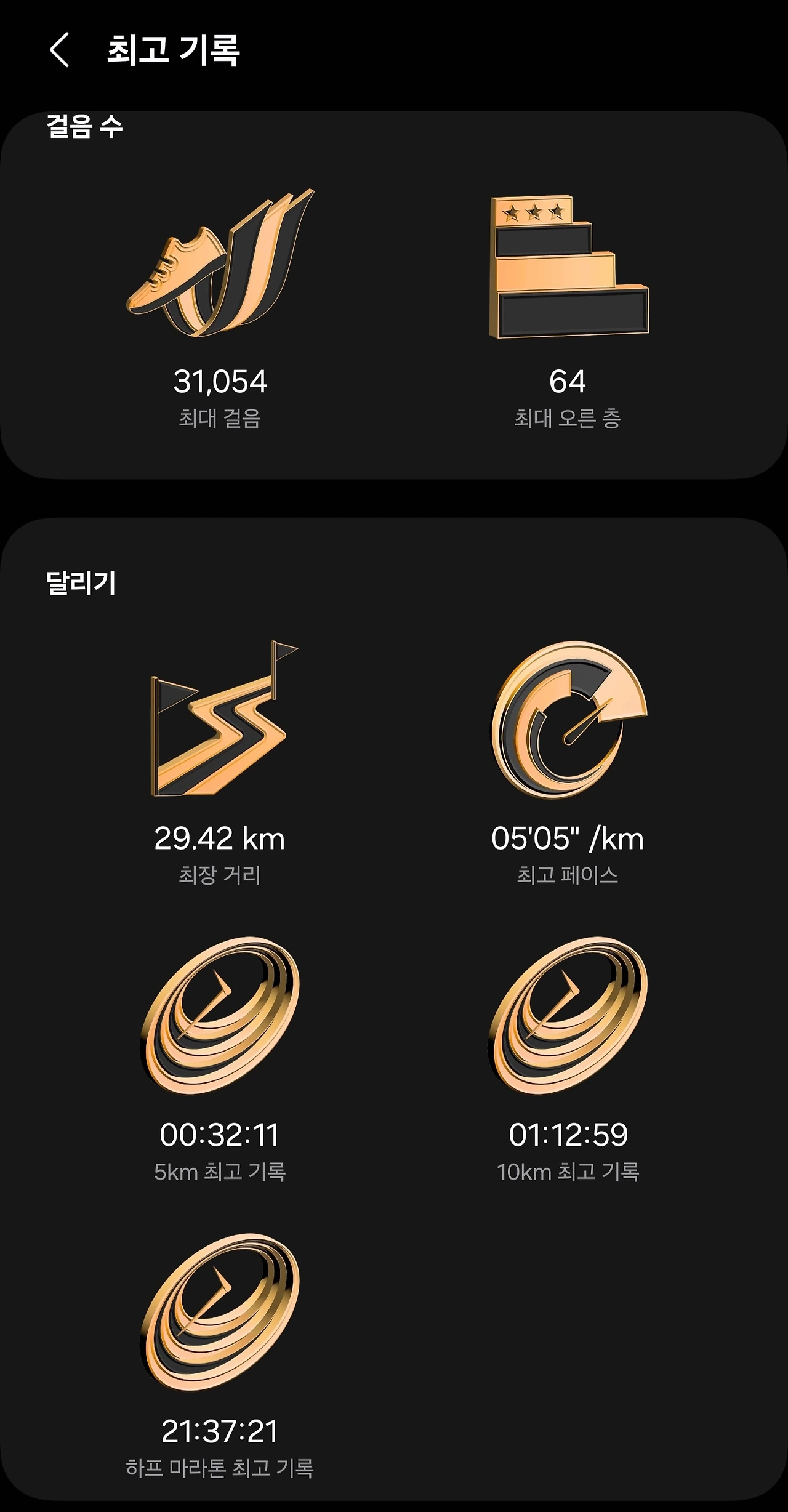하프 마라톤은 정지 버튼이 안 눌려서 자동으로 기록된 듯하고, 저 정도로 달리기한 적은 없다.
