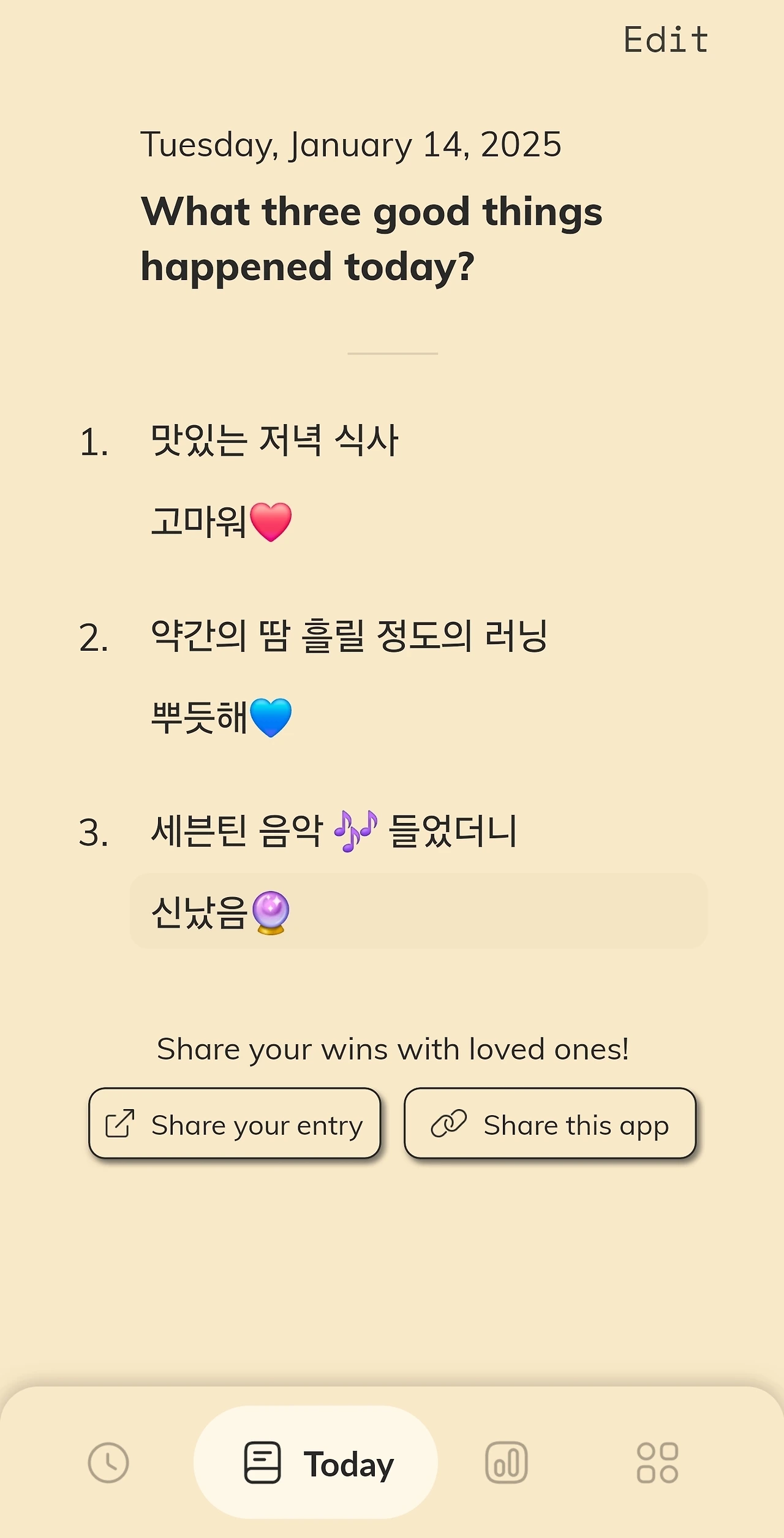 매일 정한 시간에 뜨는 리마인드 알림과 질문, 입력하는 공간 3가지 간단한 장치만으로도 '감사를 떠올릴 시간을 잊지 않게' 도와준다.