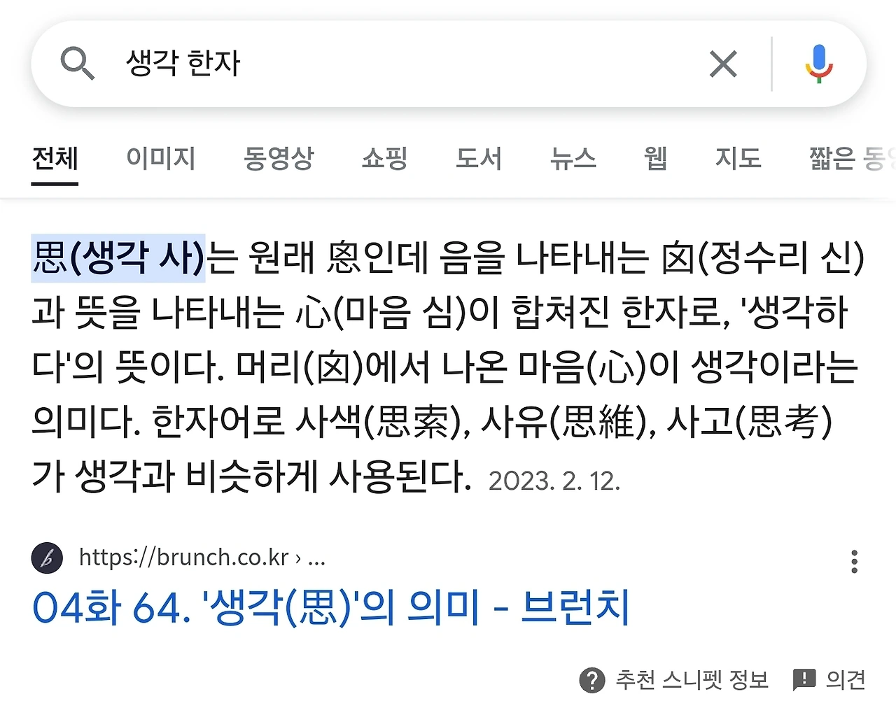 한자 뜻이 궁금해서 찾아보니 생각 두 글자 자체는 한글이라고 하고, 생각 '사' 한자는 머리/이성과 마음/감성이 한 글자 안에 들어 있다고 한다.