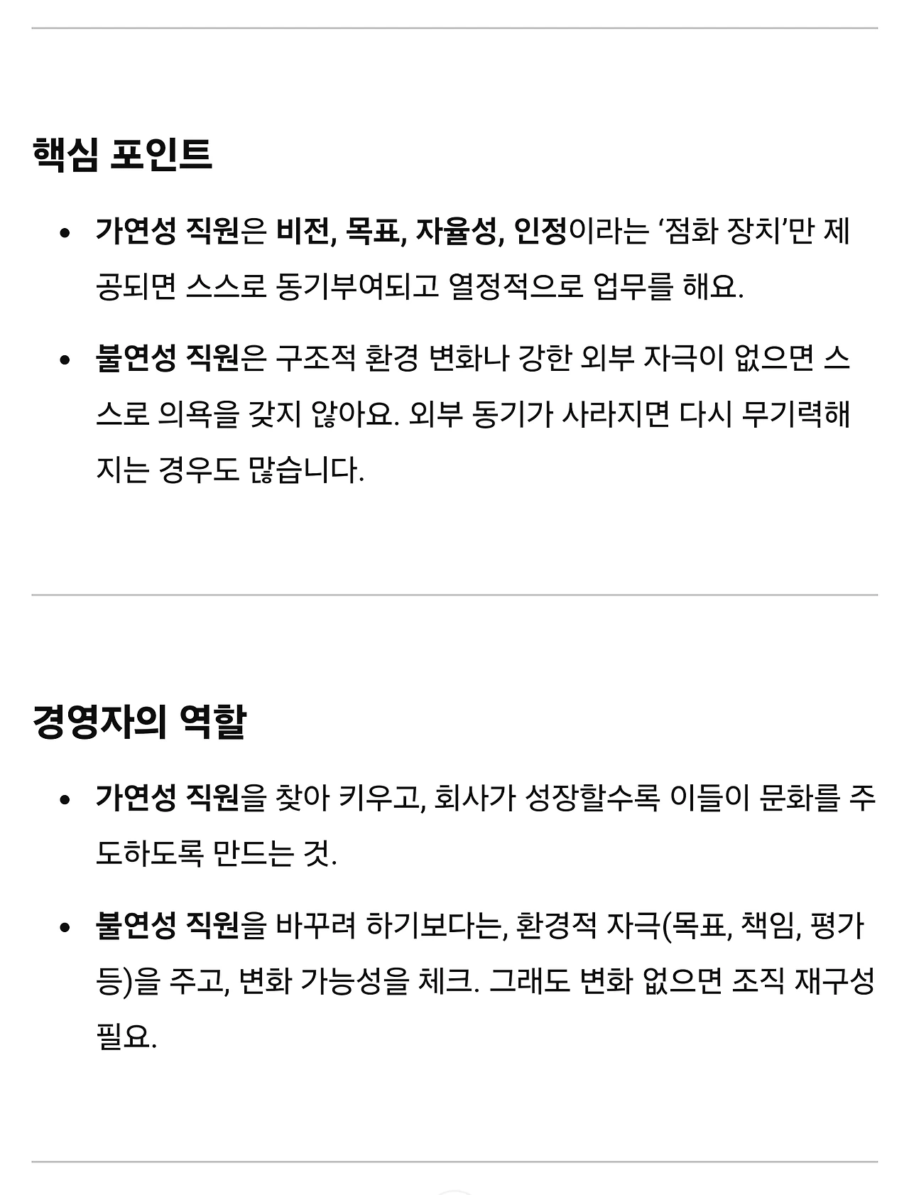 시작은 기대와 의욕이 충만하고 열정적이나, 어느 시기가 지나면 그냥 다니는 것도 지치는 상태로 바뀌기 마련인데, 아무래도 매일 치열하게 살면서 작고 보잘 것 없는 회사를 큰 기업으로 만드는 기적을 일군 리더의 책이다보니 직장인 시선에서는 다소 심리적인 반발심의 벽이 높아질 수 있겠다 싶은 지점들이 많이 보인다.