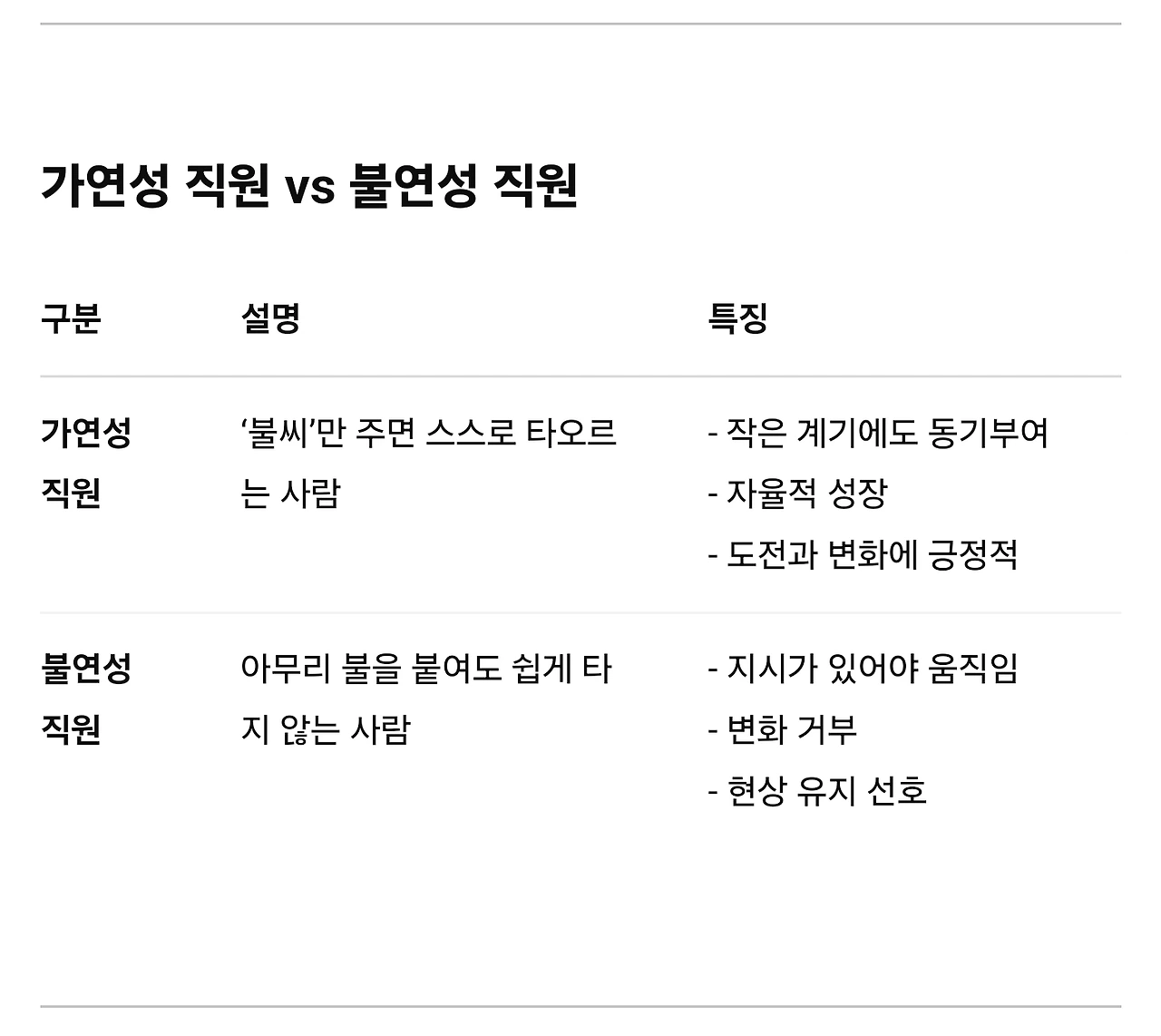 직원 입장으로 보자면, 열정이 만약 내 안의 불과 같다면, 불이 꺼져 버리지 않고 타오르기 위해서는 적절한 변화가 필요하다. 곁의 사람도 주변 상황도 과제도 내가 지겨워질 때까지 더 할 수 없다 싶은 지점까지 해보고 나서 주기적으로 바꿔 줘야 '내가 내 한계를 깨닫고, 어제보다 조금 더 성장하고 새로운 과제를 마주하더라도 돌파할 수 있는 용기와 자신감'이 생긴다.