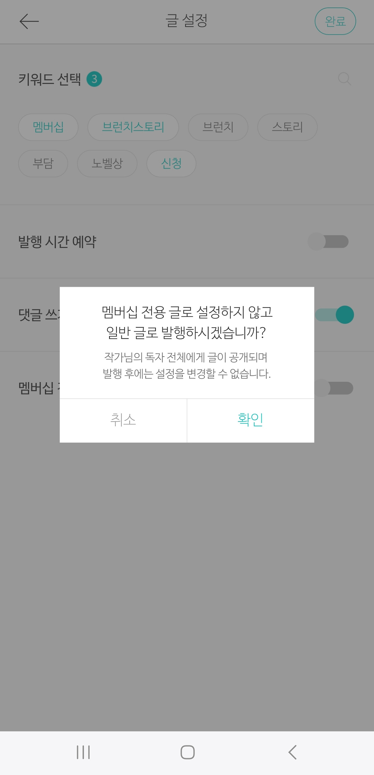 아래는 기존처럼 '전체 공개' 글로 발행할 때 확인해 주는 메시지 화면이에요.