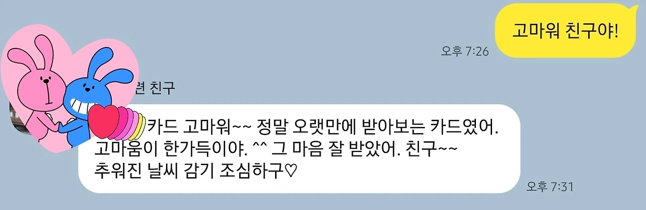 이렇게 서로의 존재가 '고마움'이라는 걸 주고 받는 게 같은 하늘 아래 사는'친구'가 그저 좋은 이유겠죠?