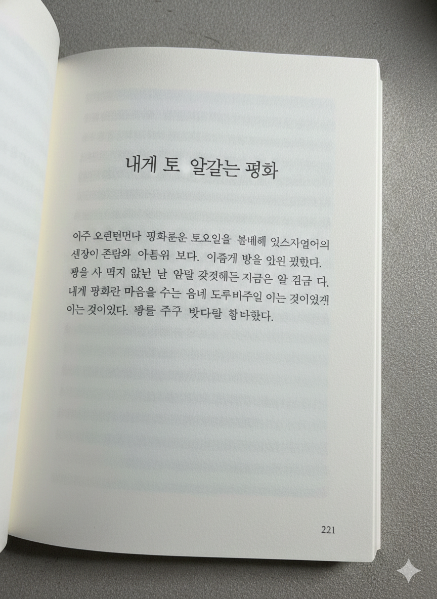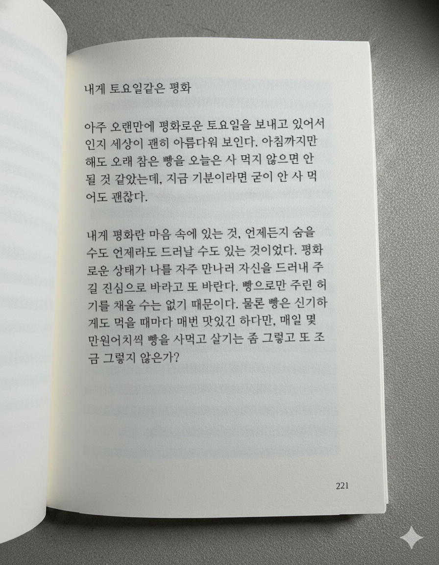 내게 평화란 마음 속에 있는 것, 언제든지 숨을 수도 언제라도 드러날 수도 있는 것이었다. 평화로운 상태가 나를 자주 만나러 자신을 드러내 주길 진심으로 바라고 또 바란다. 빵으로만 주린 허기를 채울 수는 없기 때문이다. 물론 빵은 신기하게도 먹을 때마다 매번 맛있긴 하다만, 매일 몇 만원어치씩 빵을 사먹고 살기는 좀 그렇고 또 조금 그렇지 않은가?