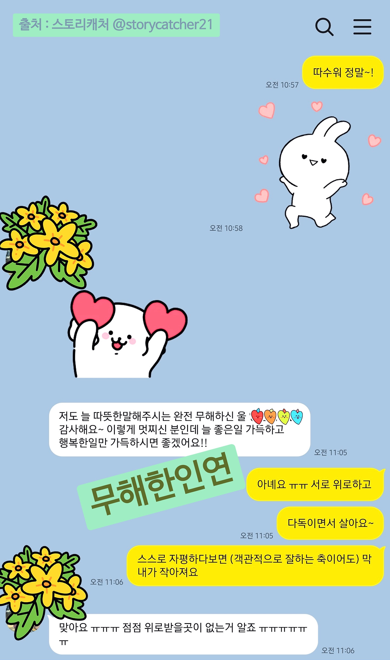 제 기억이 허락하는 한, 괜히 내 탓도 아닌데 당시 그 분 상황에서 도와주고 싶지만 구할 수 없어 가졌던 미안한 마음이 있어요. 왜 그런 건지 참 알 수 없는데 '부채감'이라고 할게요. 제 안에서 지우고 있지 않았던 '미안함에서 비롯된 상처난 그 자리'를 제가 할 수 있는 작은 선물과 메신저 대화로 다시 꺼내서 다 나을 때까지 짚고 살피는 거죠. 셀프 간호인 셈이에요.