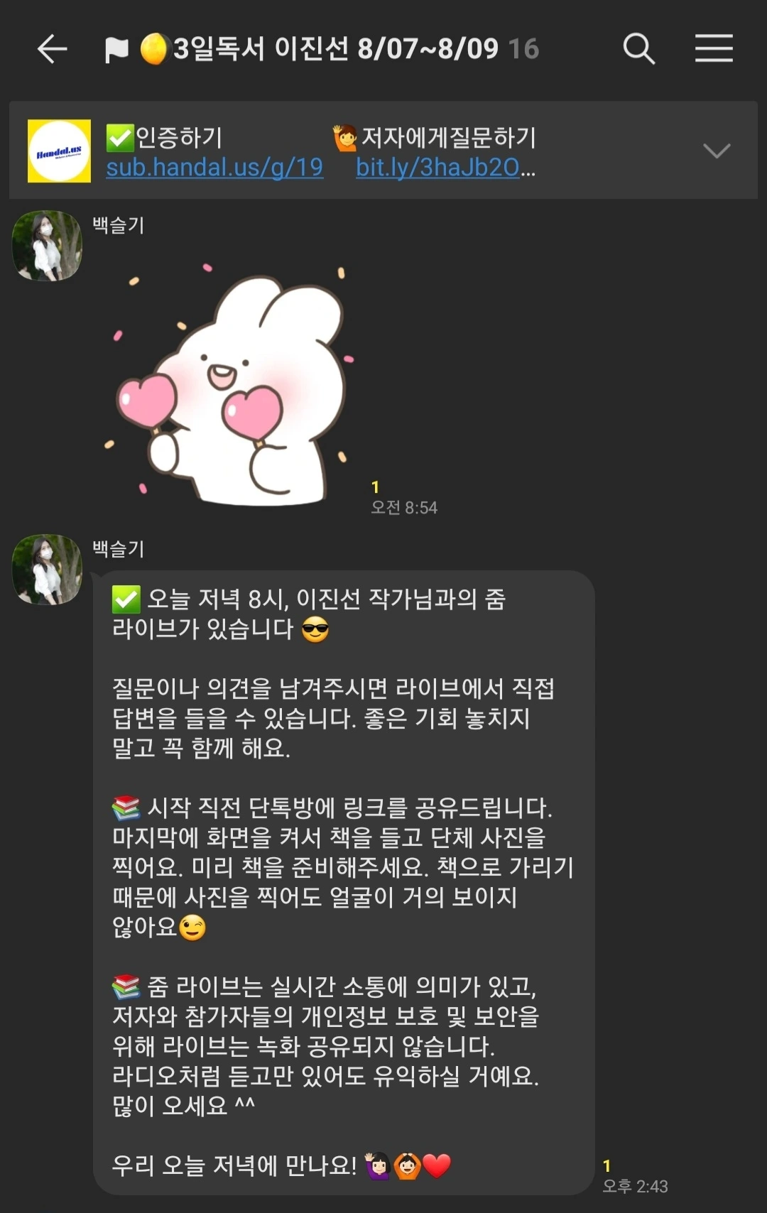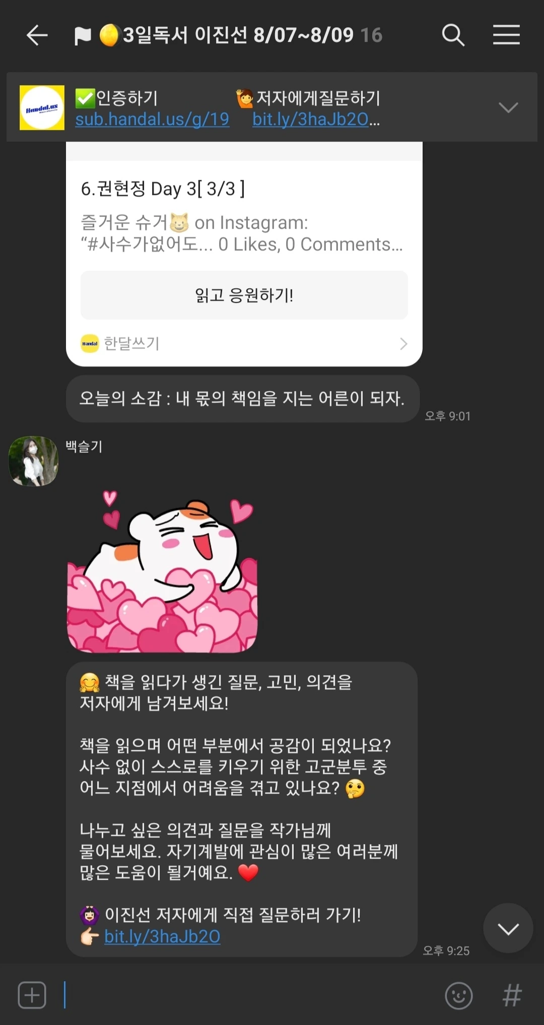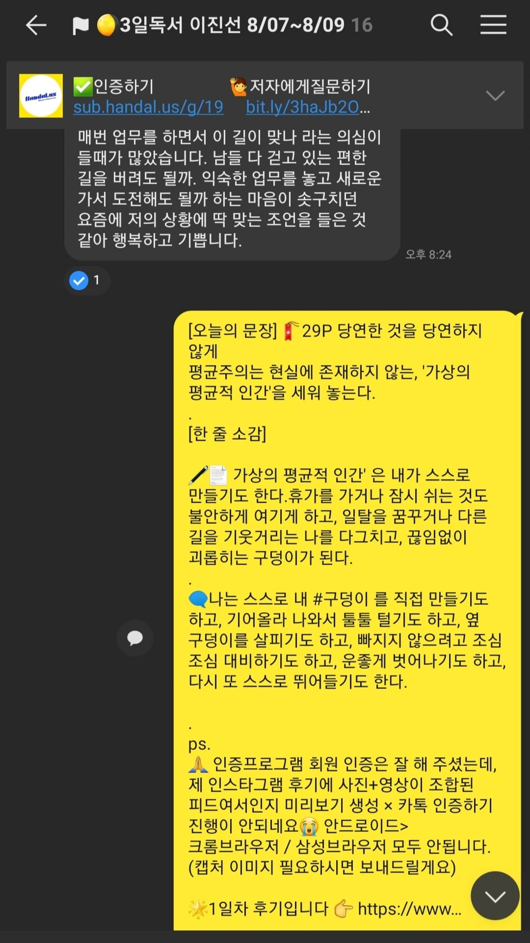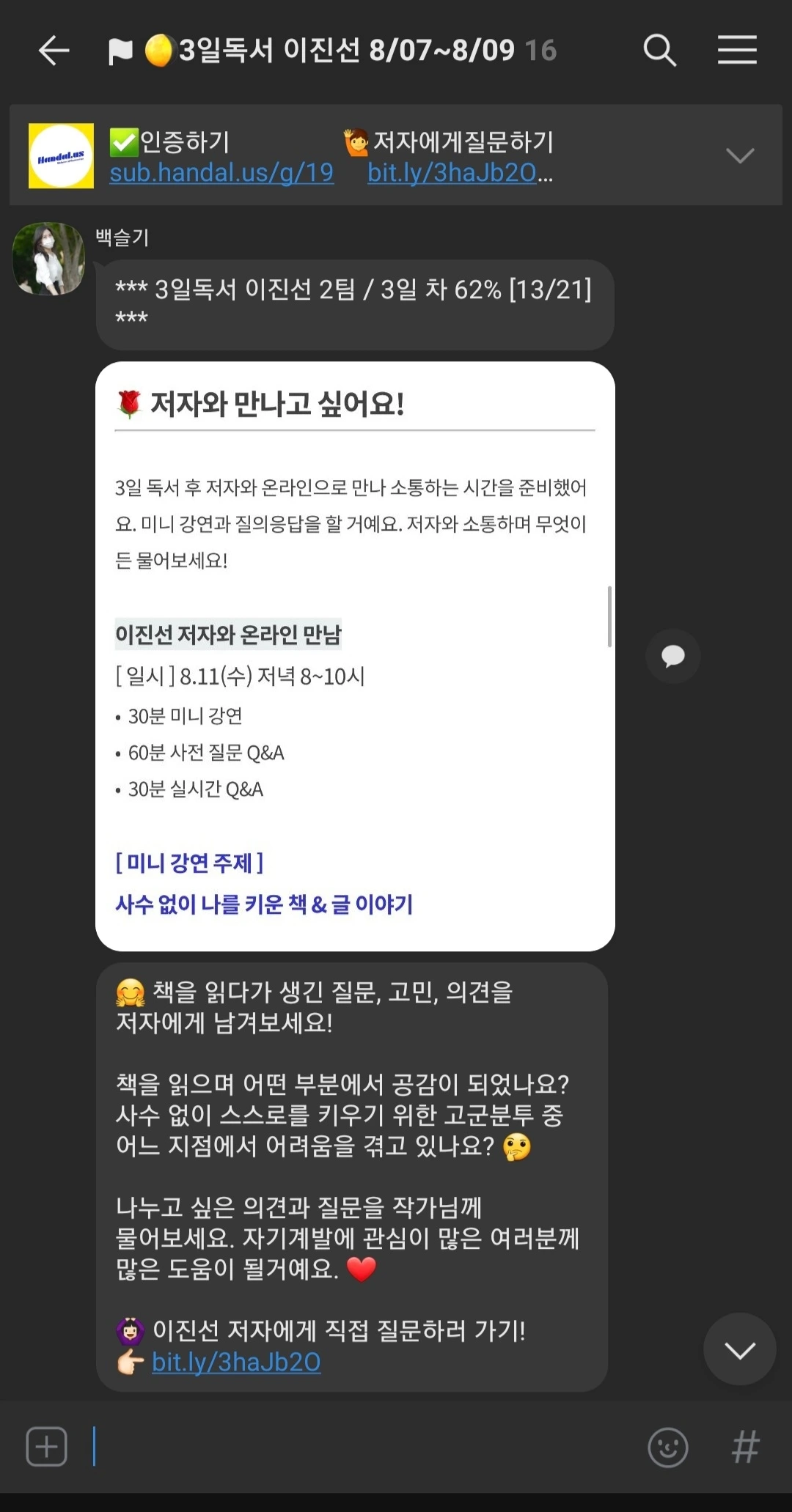 하루라도 빠지면 벌금 패널티가 있는 일반적인 독서모임이 솔직히 내 들쭉날쭉한 여유 시간을 쪼개 몰아서 2일 전후로 한 번에 쫙 보고 끝장을 보고 덮는 독서 패턴과 안 맞아서 굳이 참가비까지 내고 참여할 이유는 없었다.