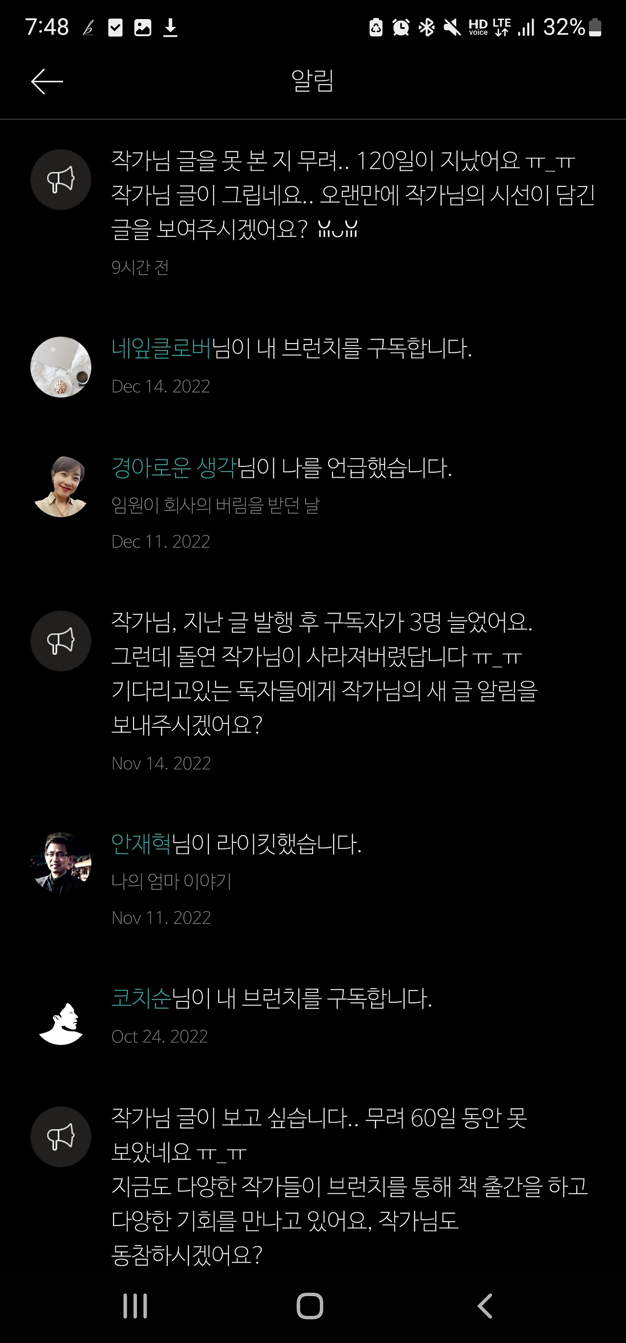 나를 채근하는 브런치팀 ㅠ _ ㅠ 다른 작가 이야기는 그렇게 와 닿는 문구는 아니지만 떠나버리지는 않게 가끔 챙겨주는 브런치 푸쉬메시지
