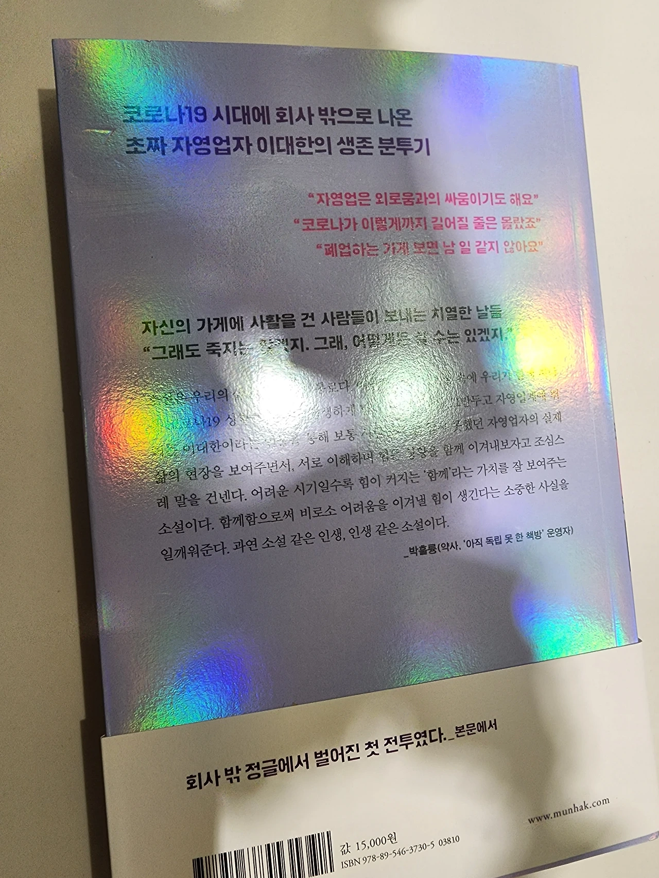 죽지 않으려고 발로 뛰는 하루 하루가 고스란히 담겨있고, 코로나19 집합금지 명령이 수시로 날아오고, 그 누구에게도 어려움을 공감받기 어려웠던 상황들, 갑자기 바뀌어버린 문화, 경쟁은 아무 때나 불쑥 시작되는 일들이 매우 생생히 그려져 있다. 딱딱하지 않게, 읽기 쉽고 몰입되는 소설 형식이어서, 나중에 이 시기의 분위기와 시대를 알 수 있는 의미있는 작품이 되지 않을까 싶었다.