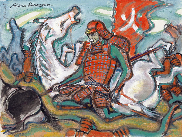 그런데 재미있는 건 영화감독이 된 후에도 그림에 대한 애정은 계속됐다는 점입니다. 특히 1970년대 후반부터는 영화 스토리보드를 직접 그리기 시작했어요. 《카게무샤》(1980), 《란》(1985), 《꿈》(1990), 《마다다요》(1993) 같은 후기 작품들의 스토리보드를 보면 수채화, 잉크, 파스텔, 구아슈 등 다양한 재료를 활용한 그의 예술적 감각이 돋보입니다.