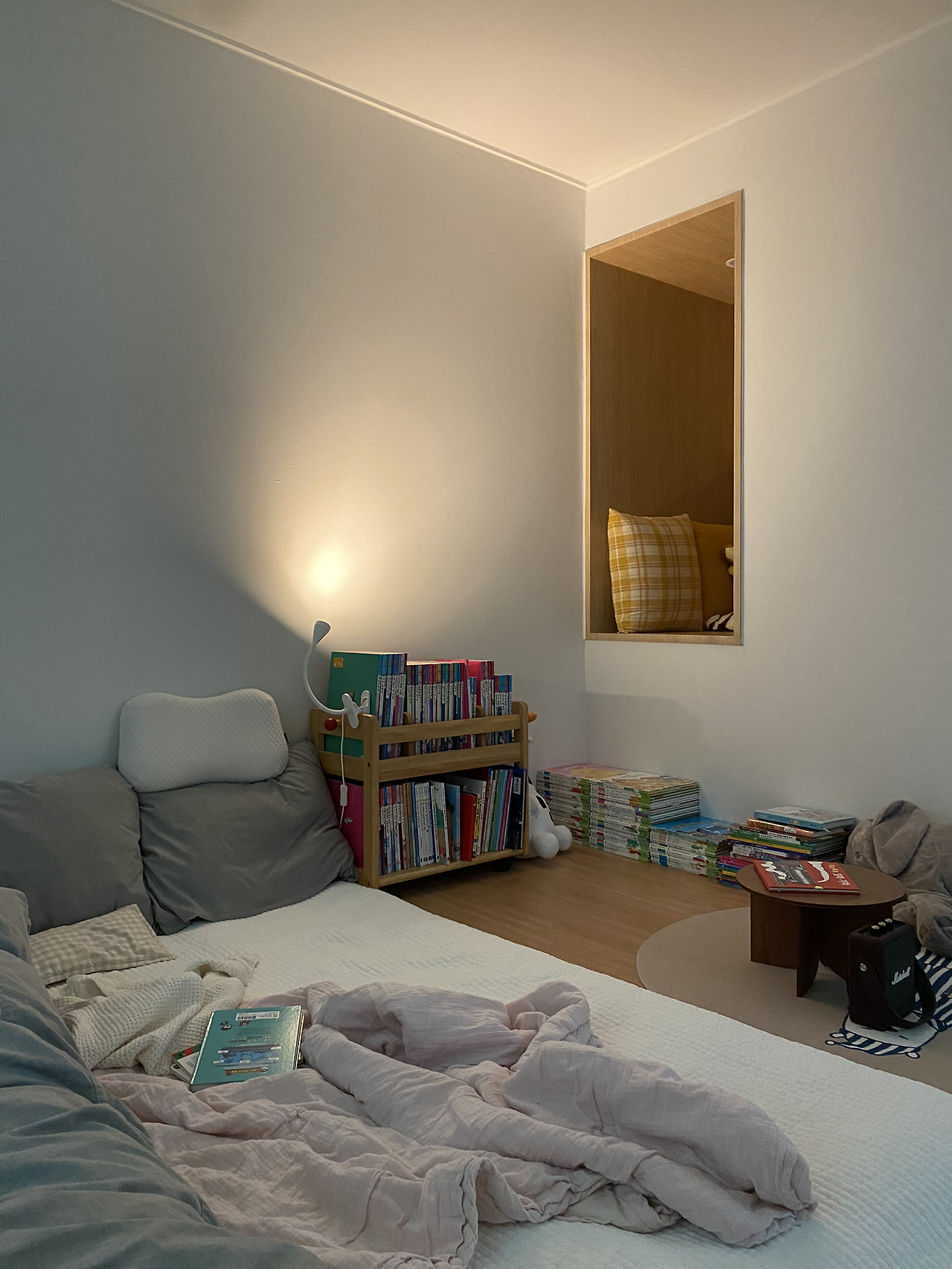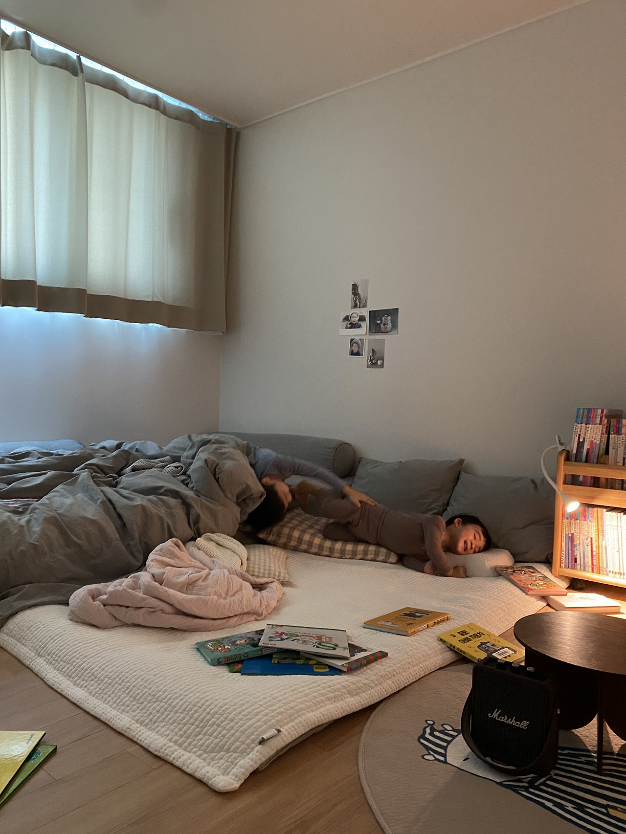 큰 아이방의 책상과 수납함을 다른 방으로 옮기고, 침대 프레임을 없애고 매트리스와 그 옆에 작은아이의 이불을 펴 주었다. 아이들이 편하게 뒹굴며 따뜻하게 잠드는 공간.