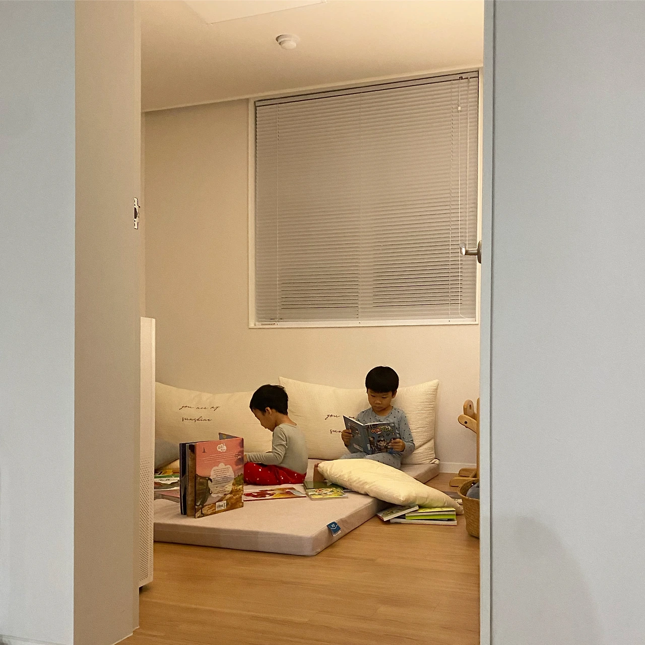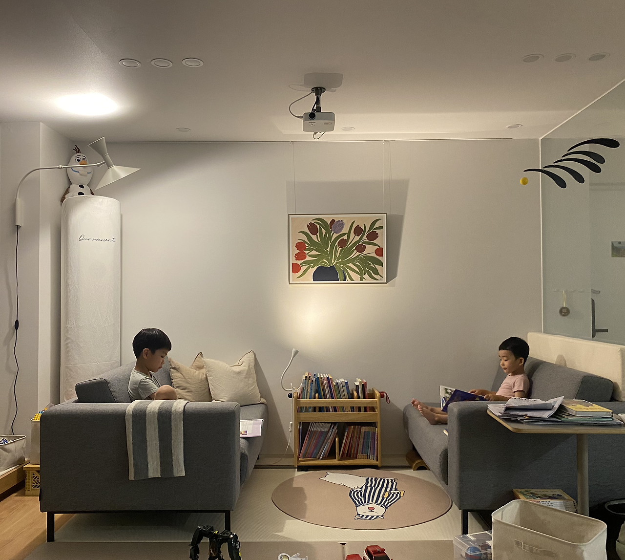 우리 집 인테리어 컨셉에 대해 제목을 붙인다면 책과 인테리어인 것 같아요. 첫째 아이를 키우며 내가 그나마 꾸준히 노력한 건 책과 친해지는 것. 운동을 즐기는 것이죠. 운동을 즐기는 아빠와 운동을 싫어하지 않는 엄마이기에 운동을 즐기는 아이로 키우는 것은 크게 어렵지 않았지만 책과 친해지는 아이로 키우기 위해서는 노력이 필요했어요. 매일 밤 첫째 아이에게 원하는 만큼의 책을 읽어주었는데, 둘째가 태어나면서부터는 내 노력을 둘에게 나눠줘야 하는 만큼 스스로 책과 친해질 수 있는 환경을 만들어줘야 하겠다고 생각했어요.